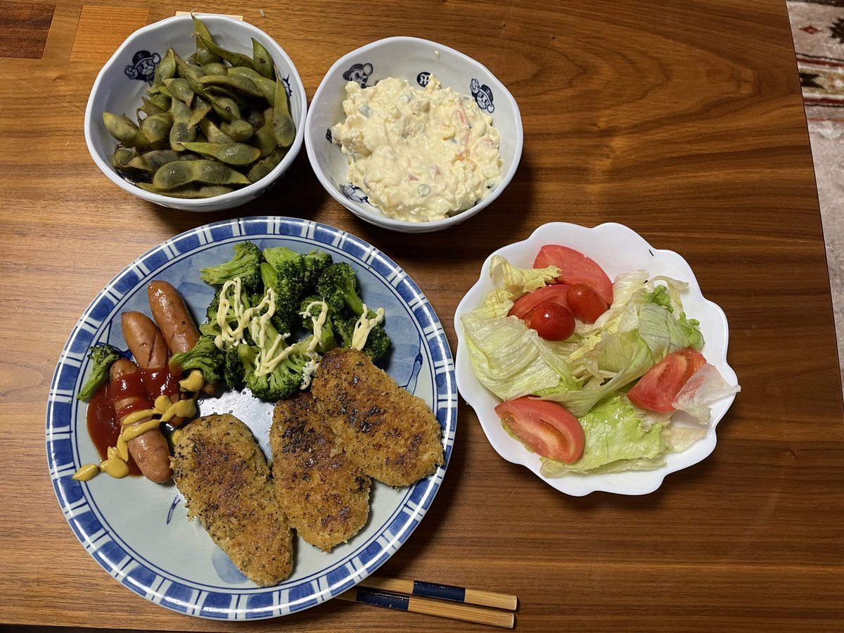 ミラノ風チキンカツ、ブロッコリーとソーセージのソテー、ポテトサラダ、野菜サラダ、黒枝豆とビール。さてなんぼ払う?品数豊富な晩ご飯(^-^)v #おとうさんの手料理 #おとうさんの晩ご飯 #家庭料理 #おうちごはん #ミラノ風チキンカツ #ブロッコリーとソーセージ #ポテトサラダ #野菜サラダ #黒枝豆 pic.x.com/5xct3VxcUn
