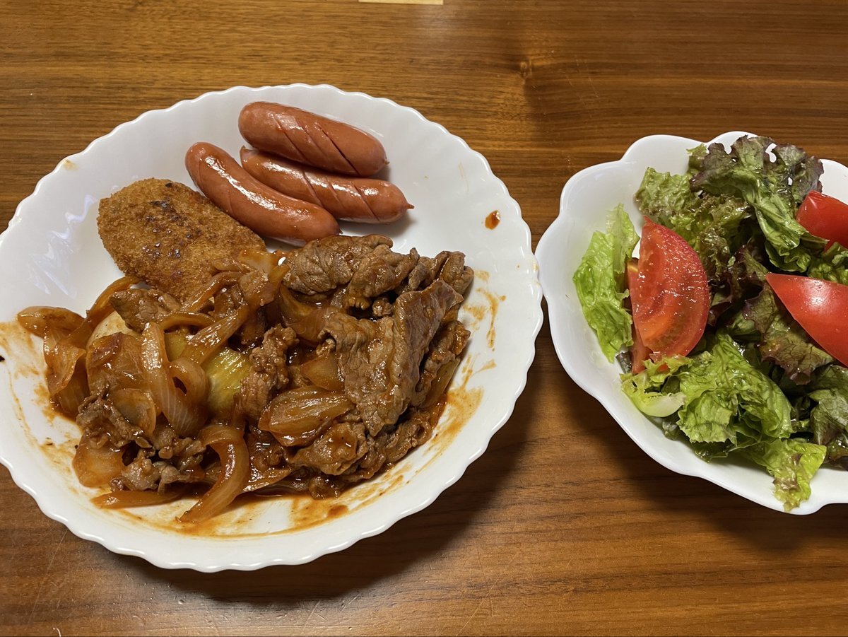 牛肉と玉ねぎのケチャップ炒めとグリーンサラダ。茶色んもんが大好きなおとうさん(^-^)v #おとうさんの手料理 #おとうさんの晩ご飯 #家庭料理 #おうちごはん #牛肉と玉ねぎのケチャップ炒め #ハッシュドビーフ #ハヤシライス #茶色おかず pic.x.com/JBlQZjgSLS