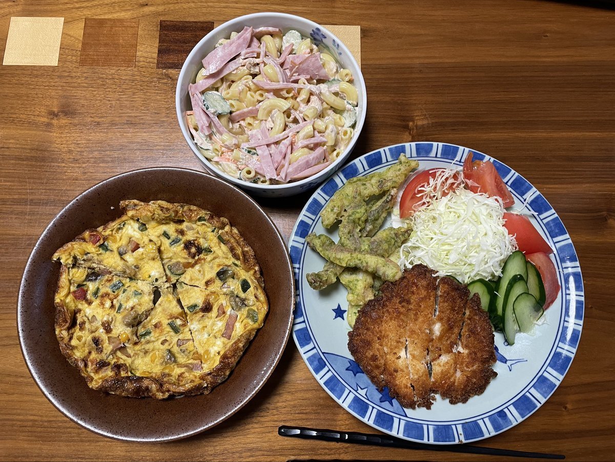 チキンカツに山盛りの千切りキャベツ、スパニッシュオムレツ、マカロニサラダ。首の後ろにシワが2本!首周りだけ太ってきてる笑 #おとうさんの手料理 #おとうさんの晩ご飯 #家庭料理 #おうちごはん #チキンカツ #山盛りの千切りキャベツ #スパニッシュオムレツ #マカロニサラダ pic.x.com/mTI5lvqFIf