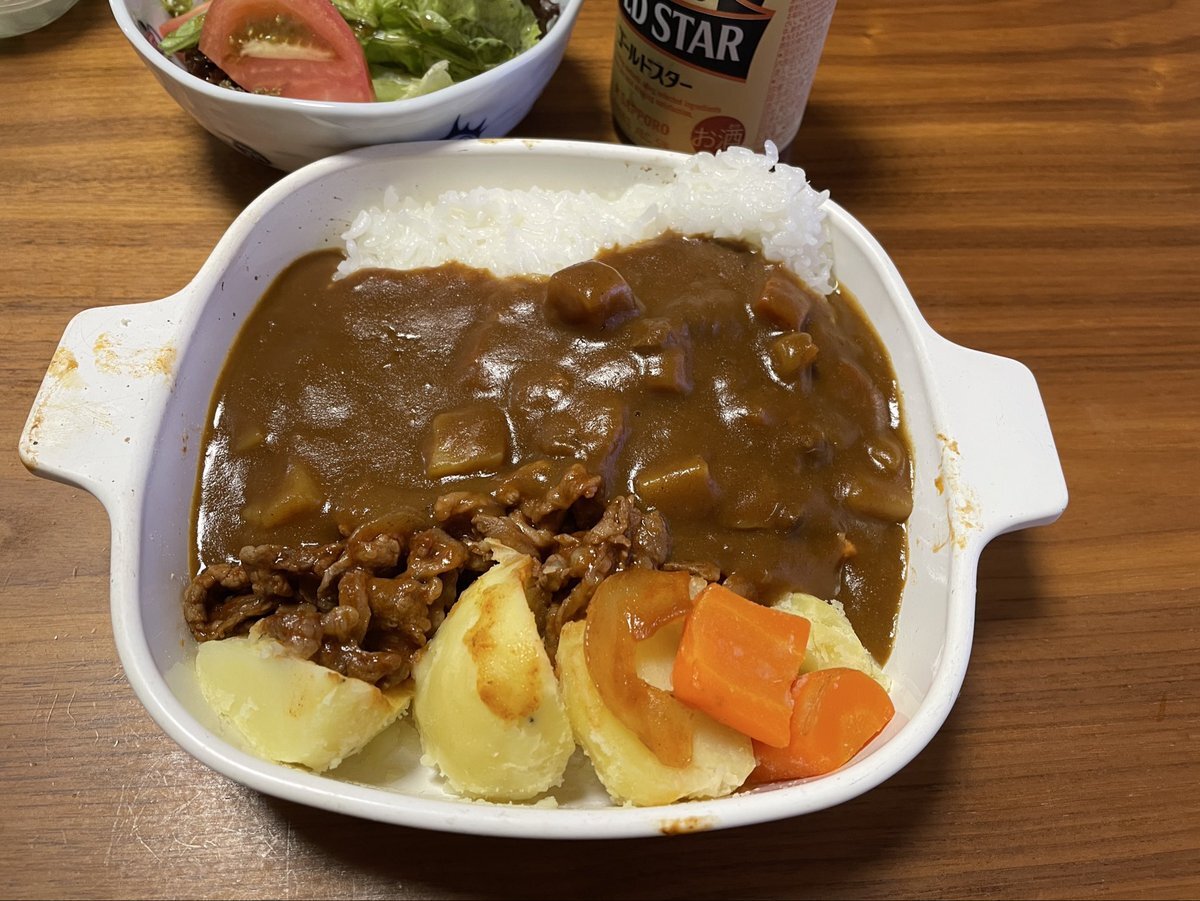 レトルトカレーに昨夜の牛肉と玉ねぎのケチャップ炒め、ジャガイモ、人参をトッピング。美味しくリメイク出来ました \(^-^)/ #おとうさんの手料理 #おとうさんの昼ご飯 #家庭料理 #おうちごはん #レトルトカレー #ジャガイモニンジントッピング #ハッシュドビーフリメイク #残りのおかずをリメイク pic.x.com/idQBpwltFl