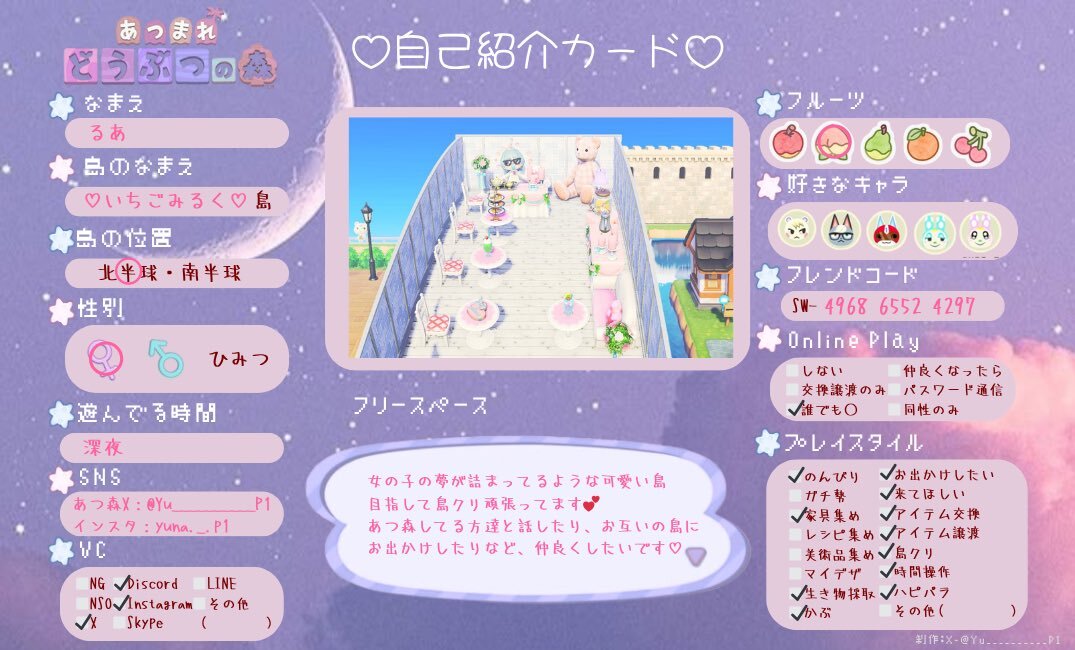 色んな人やってて可愛かったから、作ってみた♡ 少しでもこの投稿みて気になってくれる人いるといいな🥺💭 あつ森してるお友達沢山作りたいです💕 #あつ森自己紹介カード #あつ森好きな人と繋がりたい #おともだちさがし pic.x.com/YtOEgpvZQ1