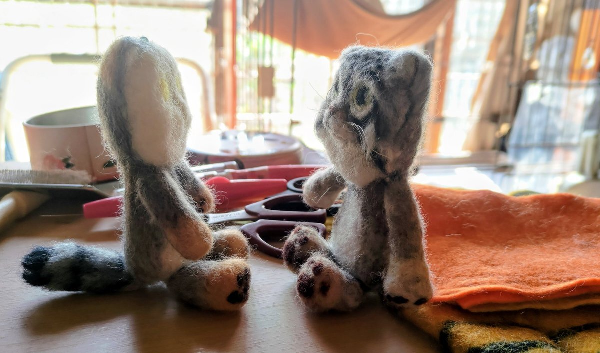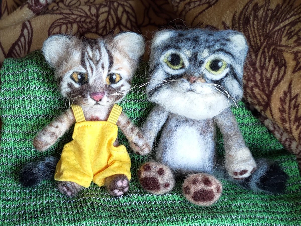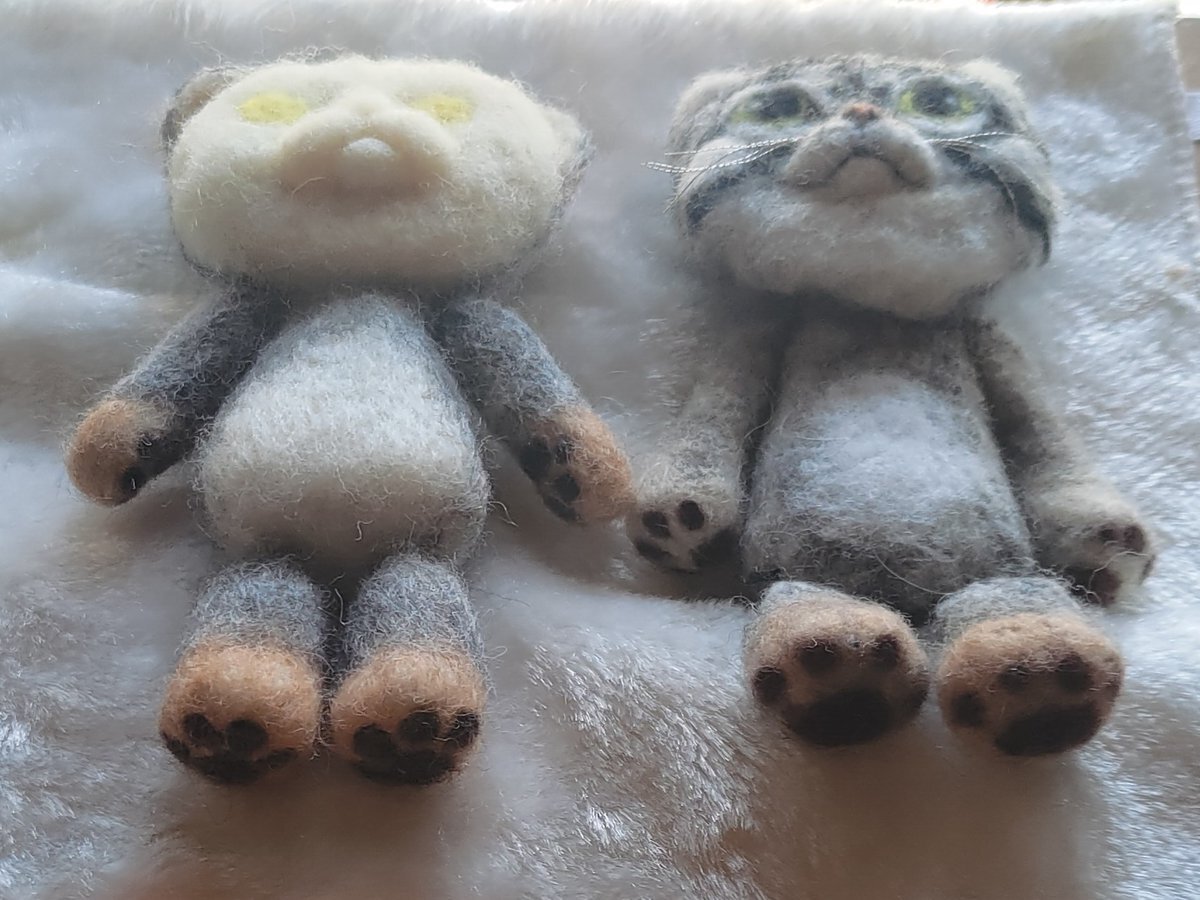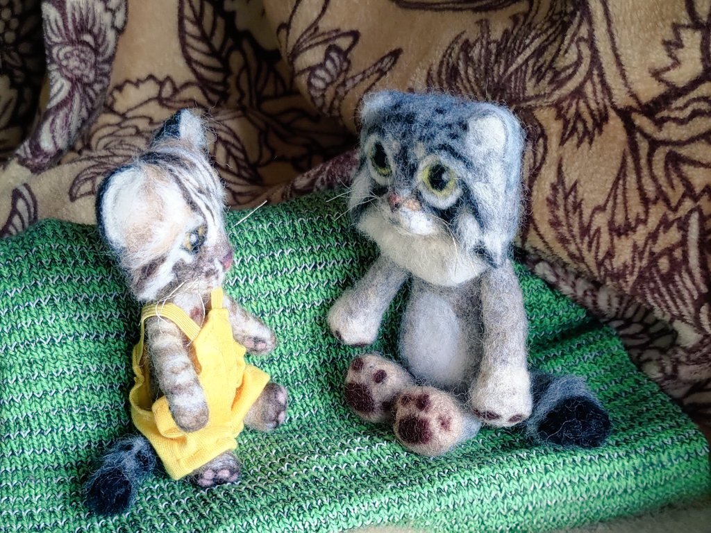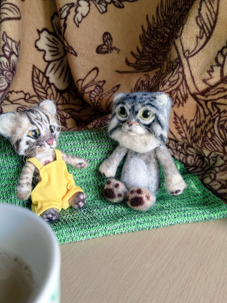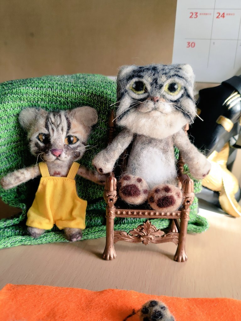 ご対面😊☺️うちの レフくんとマミちゃん   記念撮影も📷️ レフくんは おともマヌルネコ人形の体型モデルのためしばらくは本来の姿で制作の監督役😊 サイズに注意しながら いまは手足を制作中 /(.. ) #羊毛フエルト #おともマヌルネコ人形 #マヌルネコ #ハンドメイド #おともツシマヤマネコ人形 pic.x.com/KIUhIqKB63