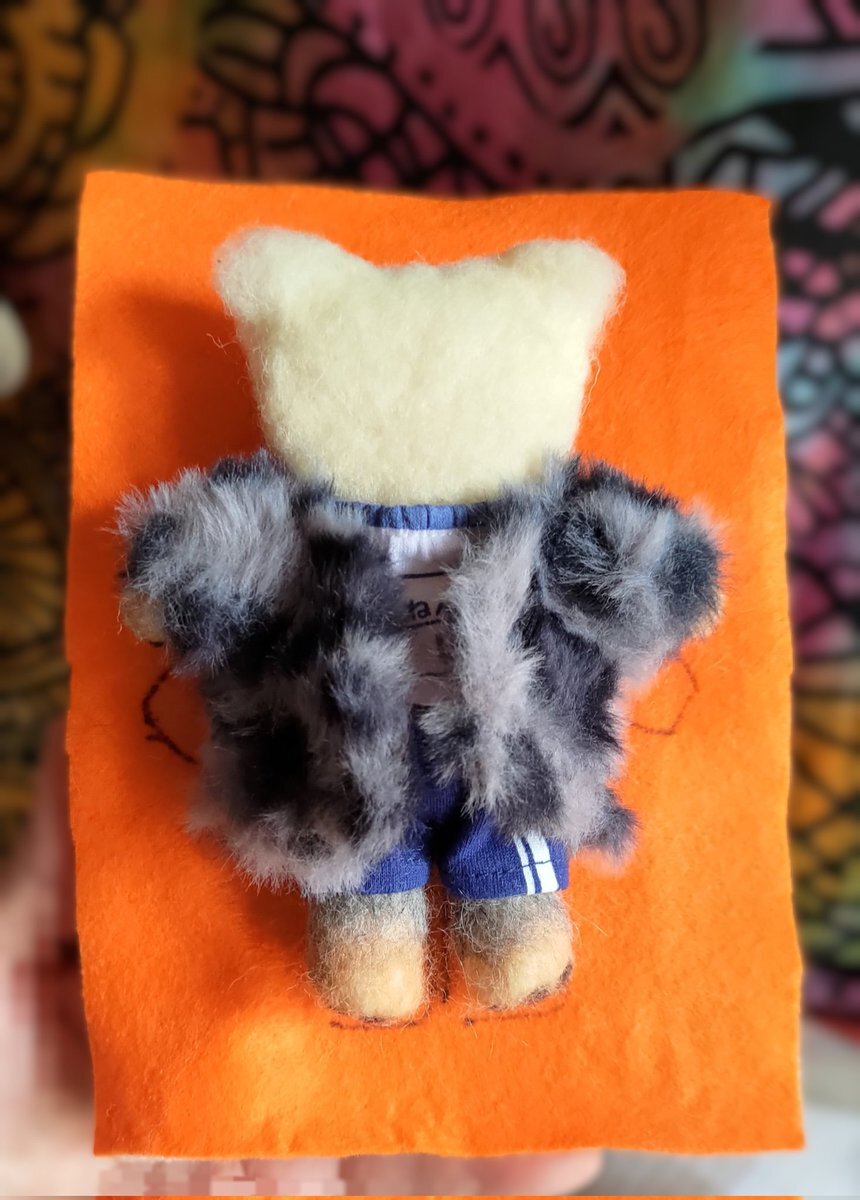 #羊毛フエルト おともマヌルネコ人形     ☆    成長記録 確認のため制作中の子に #セリアのぬいぐるみ用体操とジャージパンツ を着せて #ぬいぐるみ用レオパードフアーコート の試着が無事終了😊 この子は天然素材のみで制作中/(.. ) #おともマヌルネコ人形 #マヌルネコ #ハンドメイド pic.x.com/F6Nav3IemK