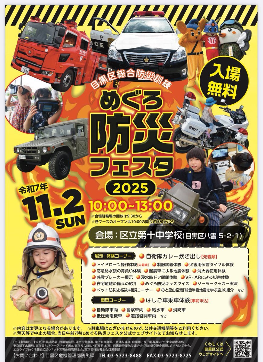 明日は目黒区防災フェスタ。 11月2日10時から、目黒区立第10中学校において、目黒区防災フェスタ開催。目黒区は総合防災訓練を東西南北中央の各地域に割り振って順次開催。開催時期も暑さ対策から11月に実施。今年も自衛隊カレーが先着順。#目黒区 #防災 #自衛隊カレー #目黒区議会 #おのせ康裕 pic.x.com/rjMxxhEWlK