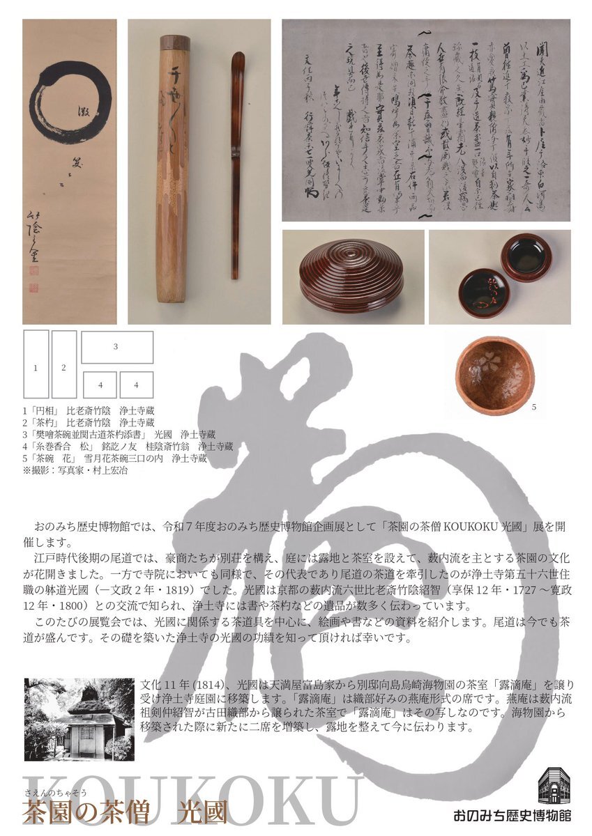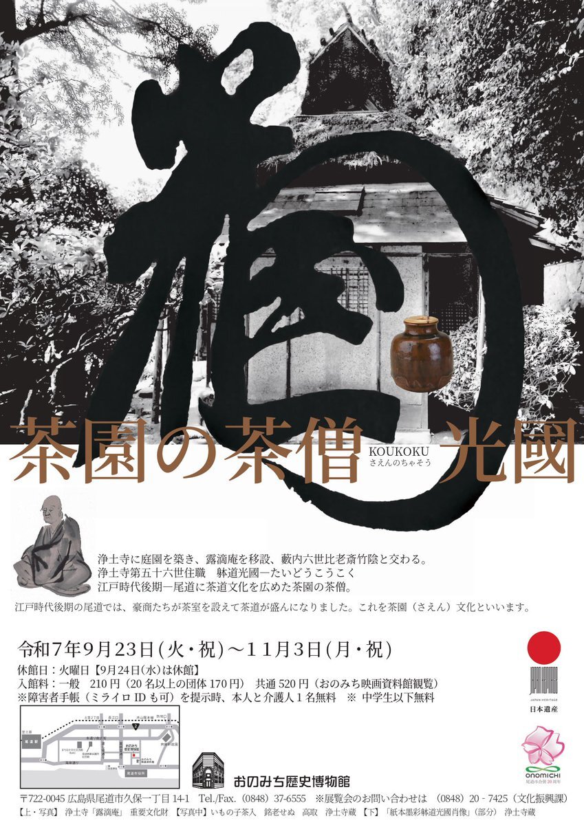 【展覧会情報】 次回、おのみち歴史博物館企画展は「茶園の茶僧 KOUKOKU 光國」 🗓 9月23日(火・祝)〜11月3日(月・祝) 📍 #おのみち歴史博物館 浄土寺に伝わる茶道関係の資料を介して、今に繋がる尾道の茶道文化の礎を築いた僧侶光國の功績を知って頂ければ幸いです🍵 #日本遺産 #尾道 #箱庭的都市 pic.x.com/MWcM4SJagx x.com/nihonisanonomi…