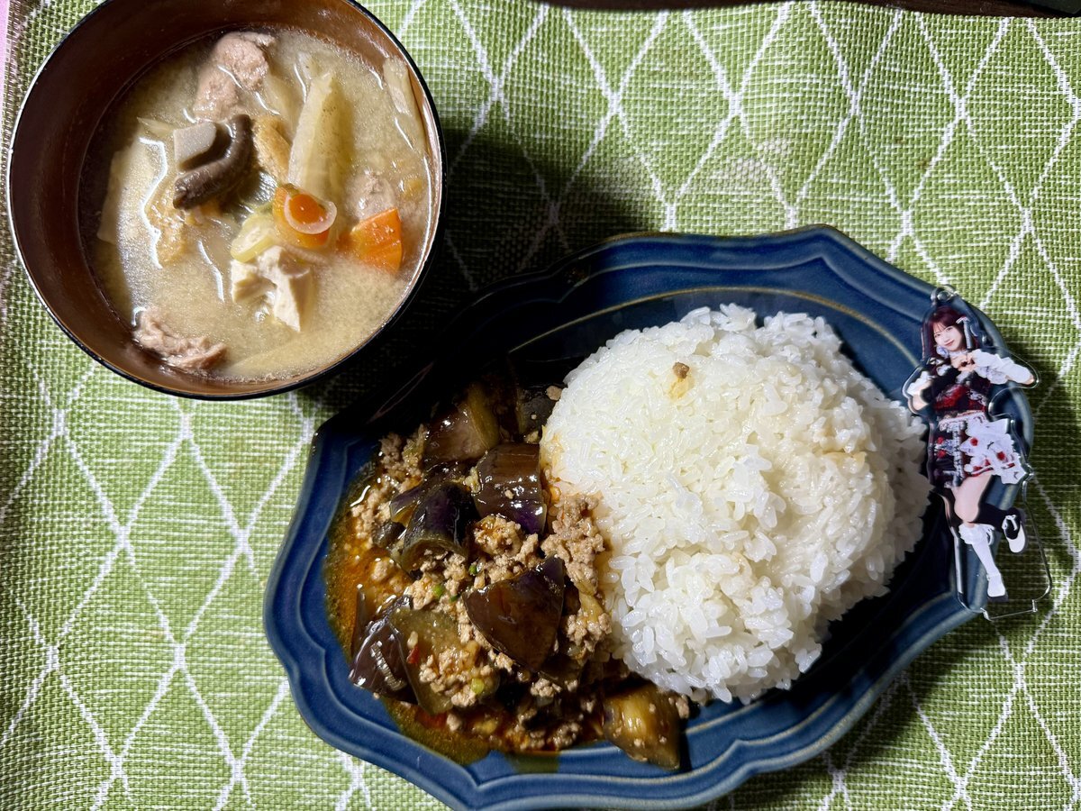 #おうちごはん𓎩𓌉𓇋 麻婆茄子と豚汁美怜寿莉亜(みさとじゅりあ)さんのアクスタ添え お弁当も毎日作ってるけど、けっこうポストしてなかった。余裕ないなぁ💦 #おうちご飯 #おひるごはん pic.x.com/NmZ7ASguHe