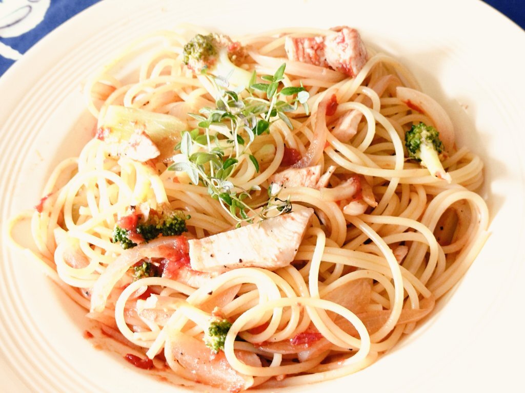 ランチはパスタ。自家製サラダチキン、たまねぎ、ブロッコリー。カットトマトケチったんあまり赤くない😅 飾りは自家栽培の生タイム。 #おうちごはん #料理好きな人と繋がりたい #一人暮らし #おひるごはん pic.x.com/JBY9bC6ULN
