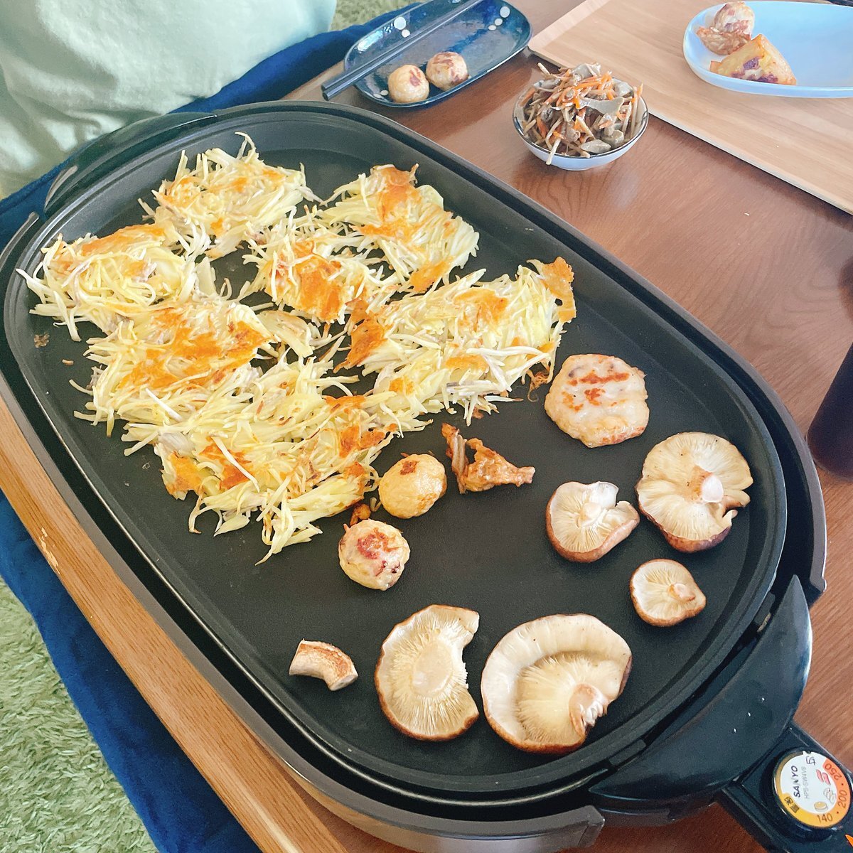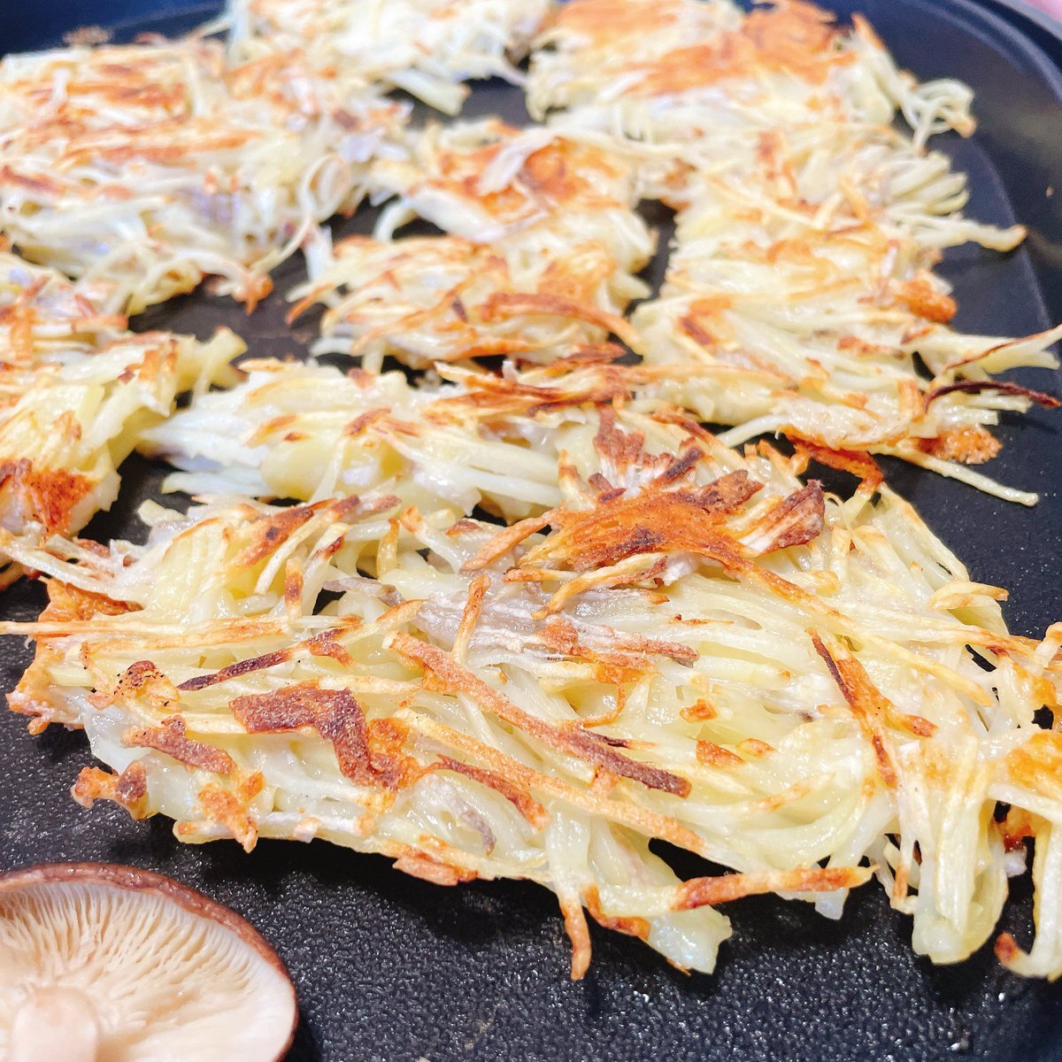 じゃがいもガレット 練り物 焼き椎茸 スライサーで千切りにしたじゃがいもとチーズ、オリーブオイルを少し混ぜ合わせただけ カリッカリに焼いた芋最高 夜もこのままホットプレートか? #おうちごはん #おひるごはん pic.x.com/yB34fG2jx8