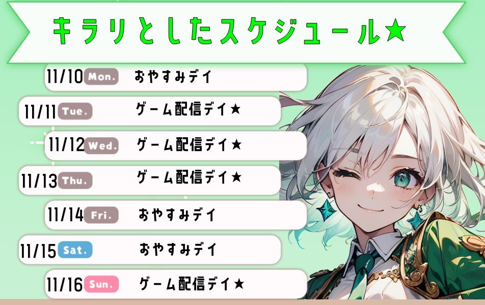 こんばんは★ 配信ありがとうやで~! ★キラリっとしたスケジュール★ 来週はこんな感じで配信していくで よろしゅうな😉 日曜日の夜はゆったりまったり して明日からの1週間頑張って 輝いていこな★おやすみなさい😉 #新人Vtuber #おやすみvtuber️ pic.x.com/1WSLhluwfc