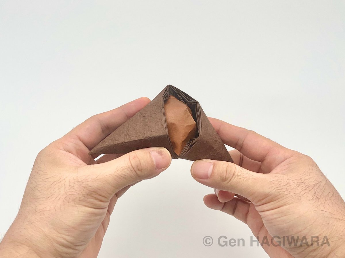 返信先:@gen_hすごっ!😳🍫✨ 切らずに一枚の紙から三角チョコパイ作れるの天才すぎる👏 質感まで伝わってきそうで、見てるだけで甘い気持ちになるね☺️ #おりがみの日