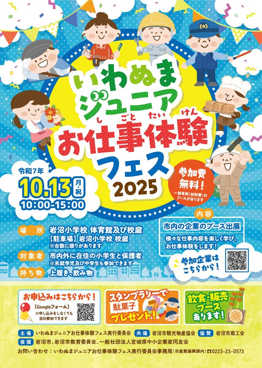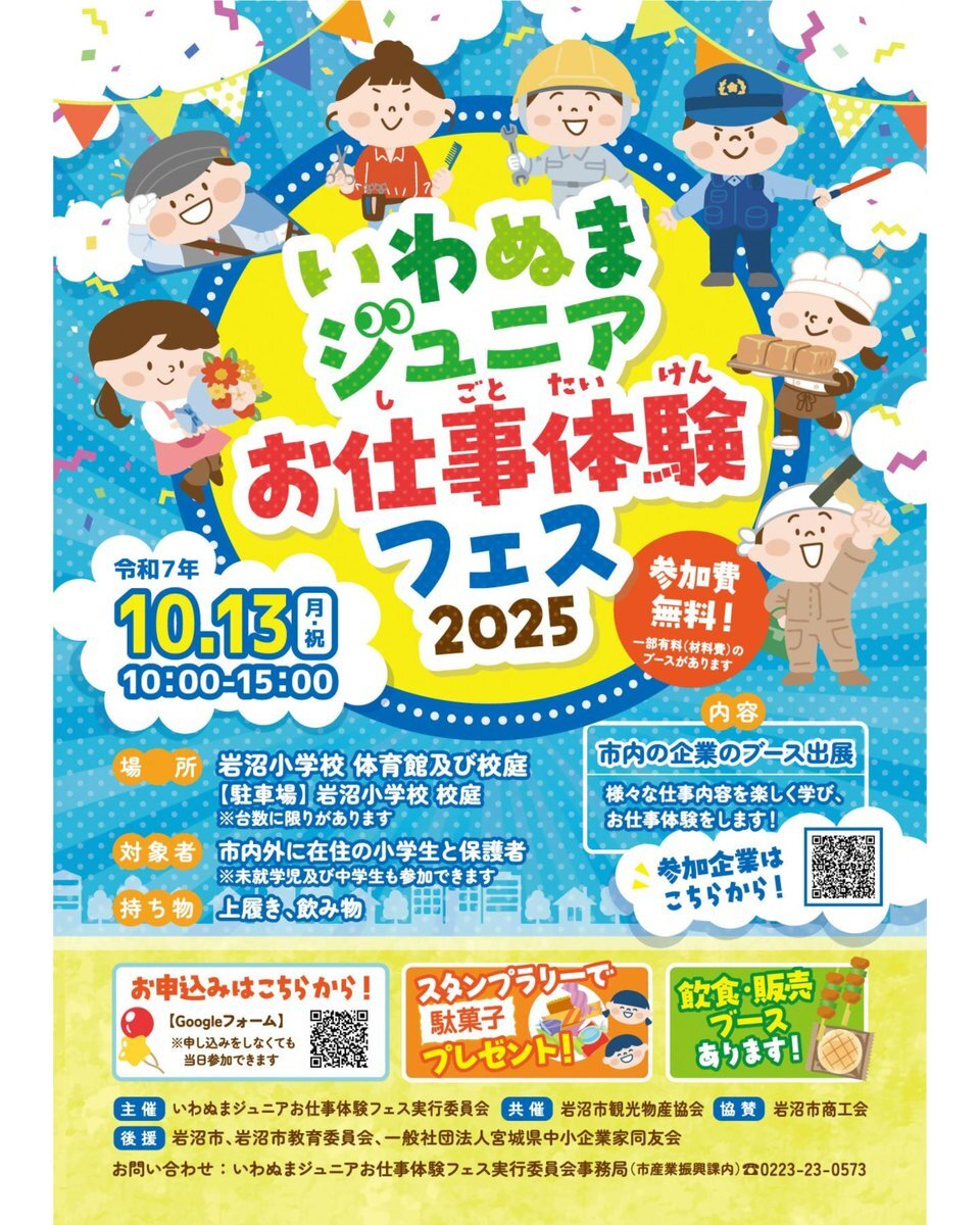 【いわぬまジュニアお仕事体験フェス2025開催】 10/13(月・祝)10:00から岩沼小学校の体育館と校庭で開催されますよ。楽しいワークショップや働く車にも乗れるそうです!家族みんなで足を運んでみてくださいね!#岩沼市 #お仕事体験 #こども #お仕事 #フェス #宮城 #岩沼係長