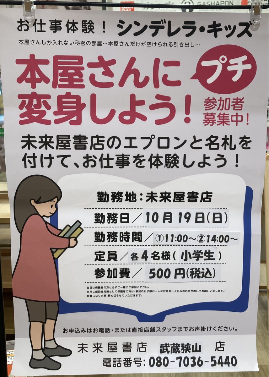 #お仕事体験#シンデレラ・キッズ 10月19日(日)11:00~、14:00〜 本屋さんのお仕事をしたい小学生を募集中です 📚 お申し込みは店頭かお電話(080-7036-5440)にて 受け付けています。 ご参加お待ちしております✨ ※定員になり次第受付終了とさせていただきます。 #未来屋書店武蔵狭山店 pic.x.com/EGDNUe0QiZ