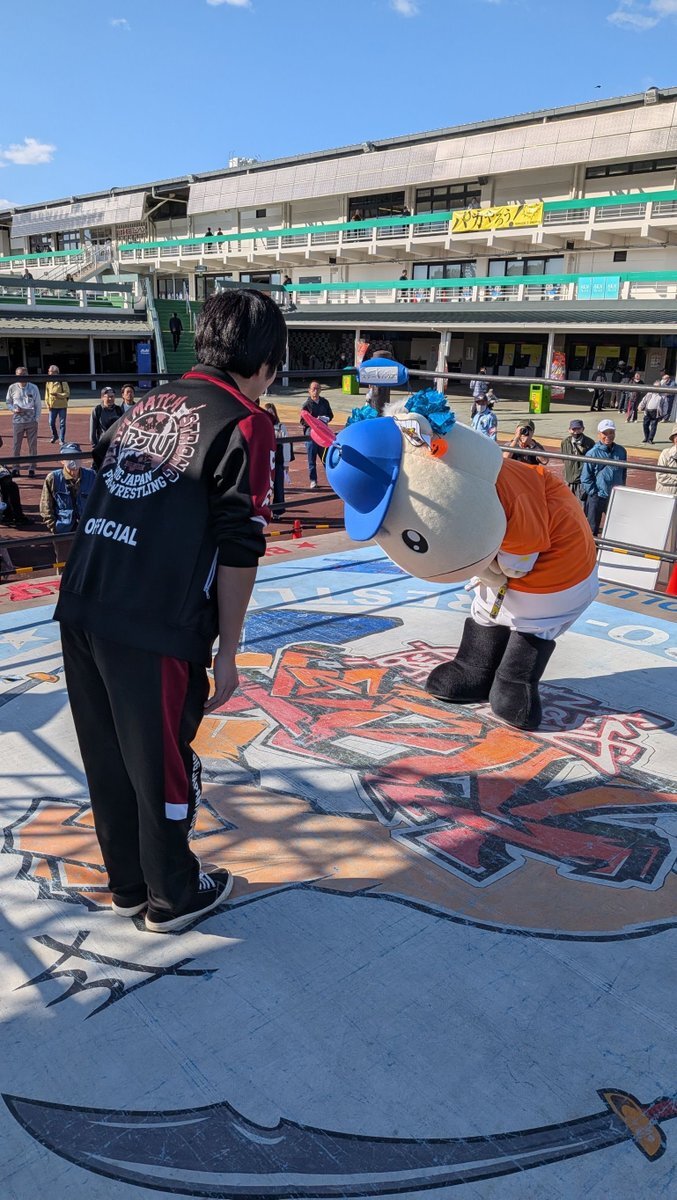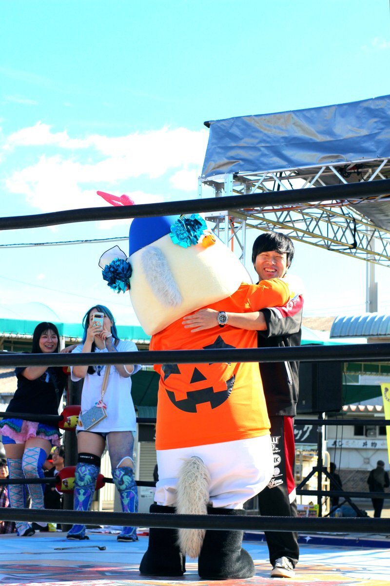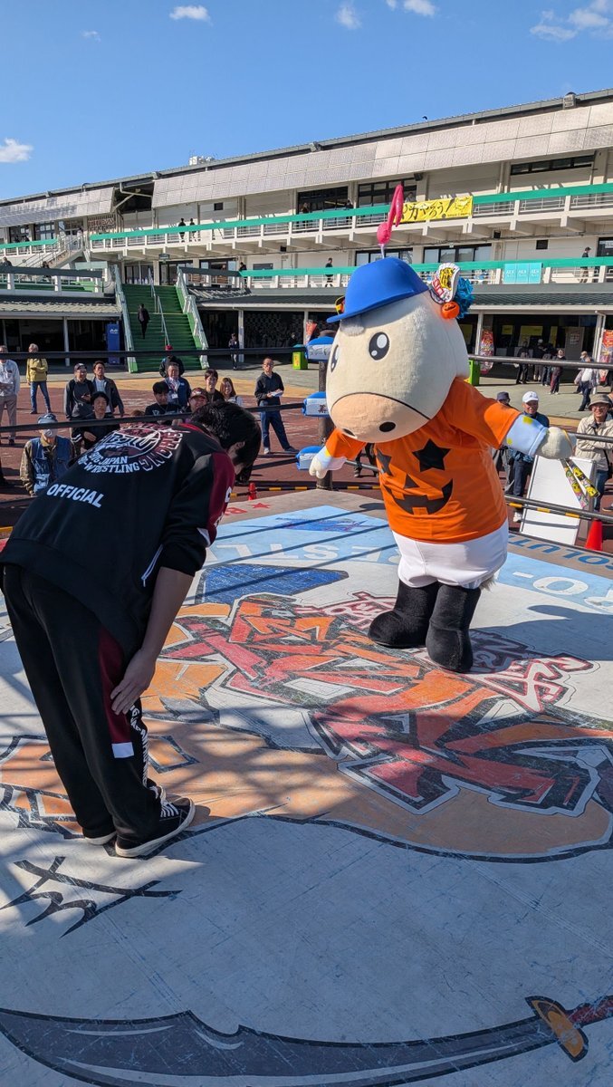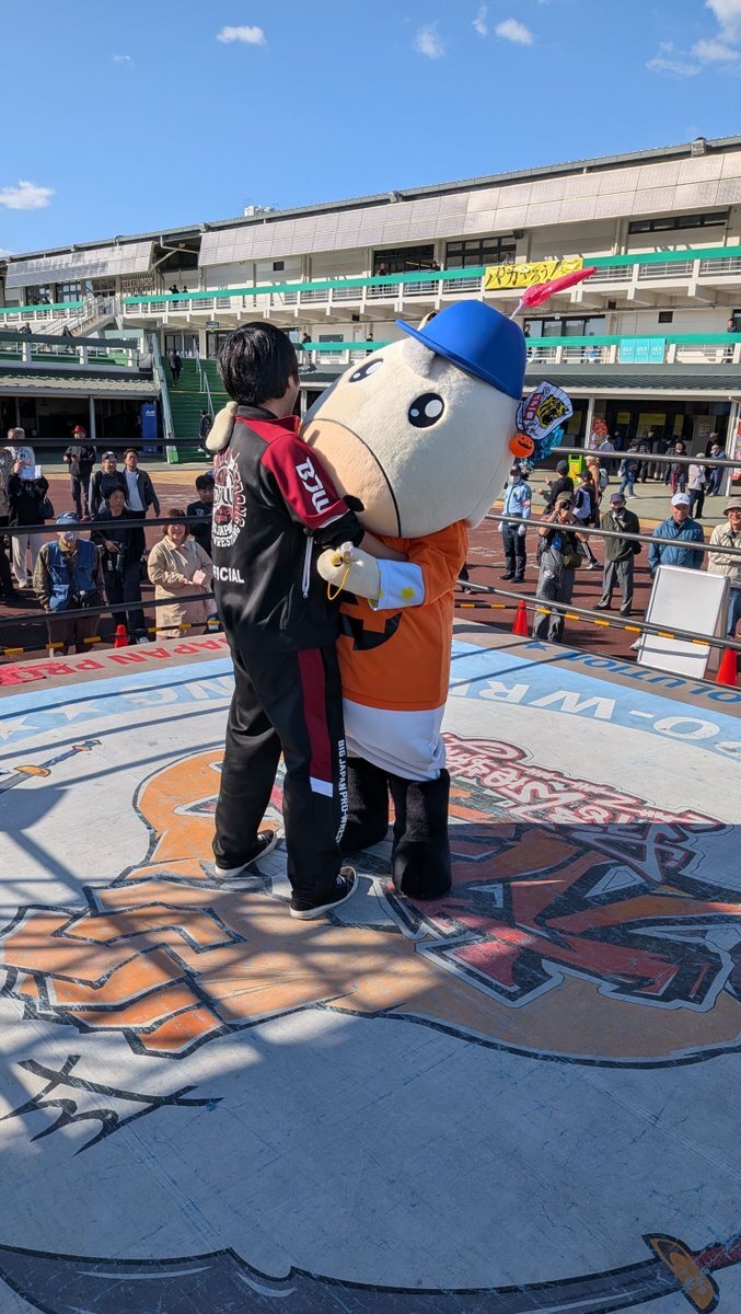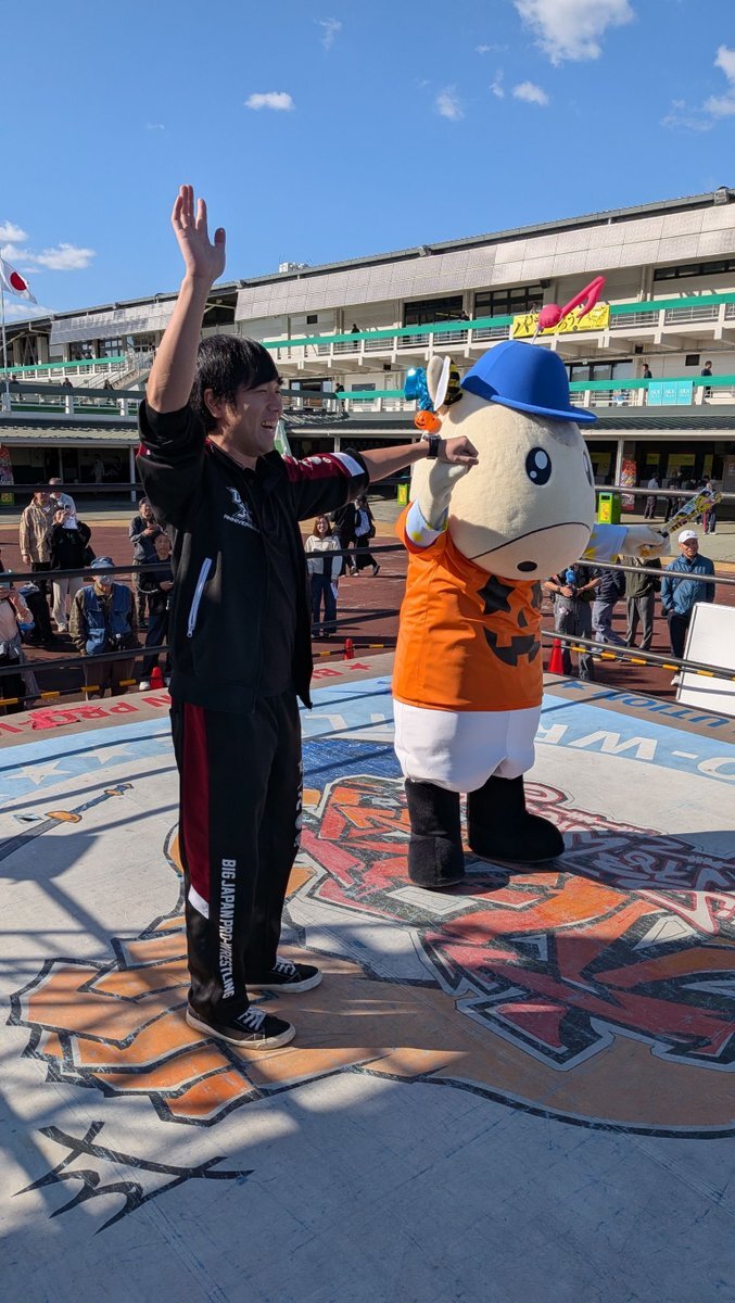 園田競馬場の着ぐるみキャラ「そのたん」と爽やかな笑顔で抱擁する大日本プロレス・熊川リングアナ💕 その後ろで、尾﨑・世羅 両選手が楽しそうに見てる👀✨ 📅 2025年10月29日(木) ☀ 📍 兵庫・園田競馬場 特設リング #bjw #大日本プロレス #園田競馬 #そのだけいば x.com/ybear0219/stat…