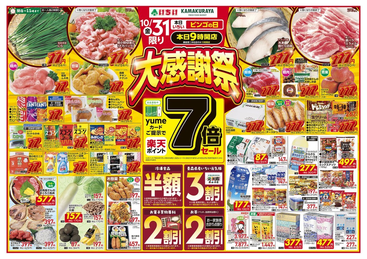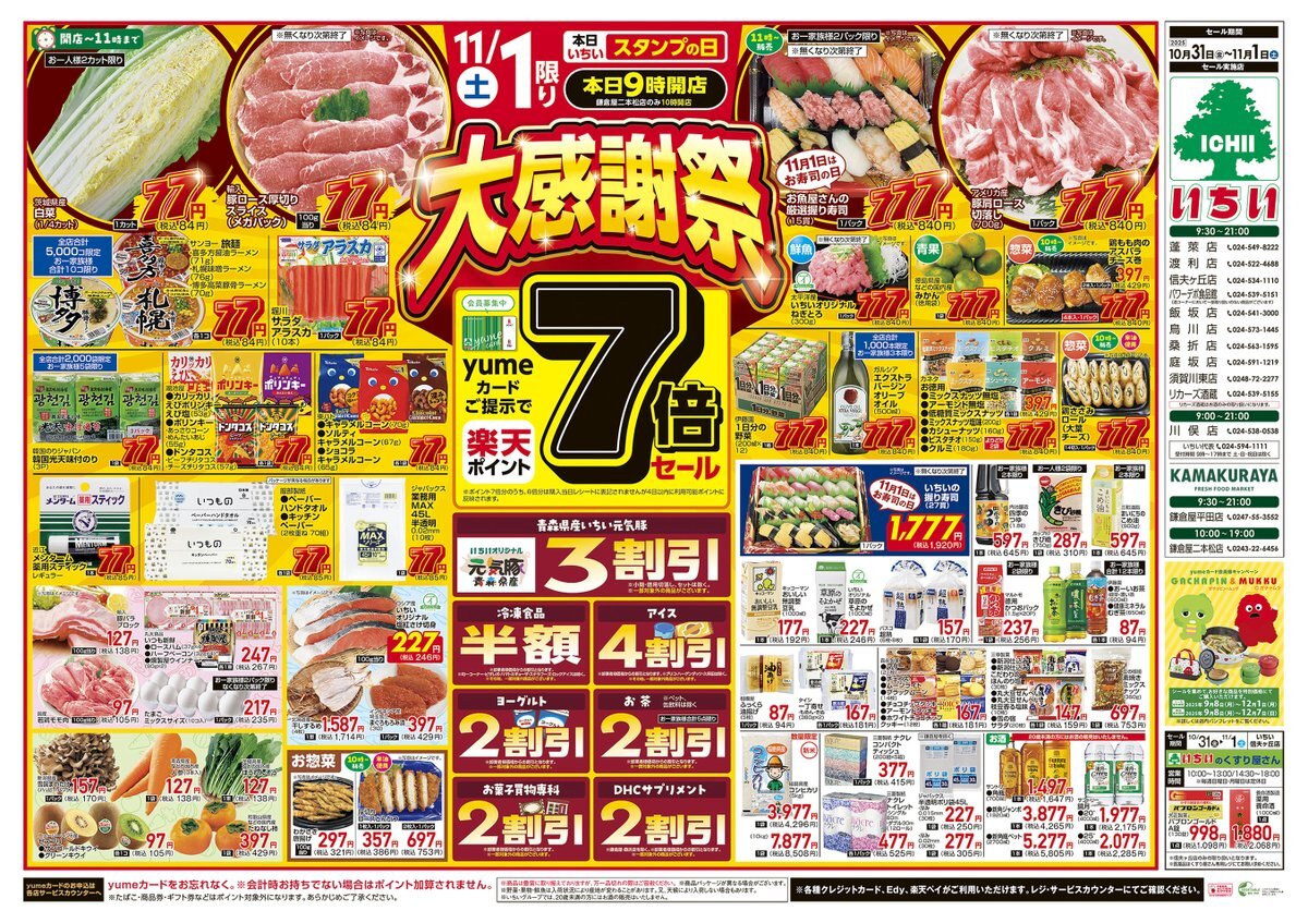 10/31・11/1は \2日間連続/ 楽天ポイント7倍🎰 77円&777円のお値打ち商品が盛りだくさん👀 11月1日は #お寿司の日🍣歌舞伎の演目「義経千本桜」で源氏の武将が「寿司屋の弥助」に改名したのがこの日なんだとか🌸 いちいはお寿司の日にちなんで777円&1777円のお得なお寿司をご用意🍣 #いちい #福島 pic.x.com/V07wv7PIX3