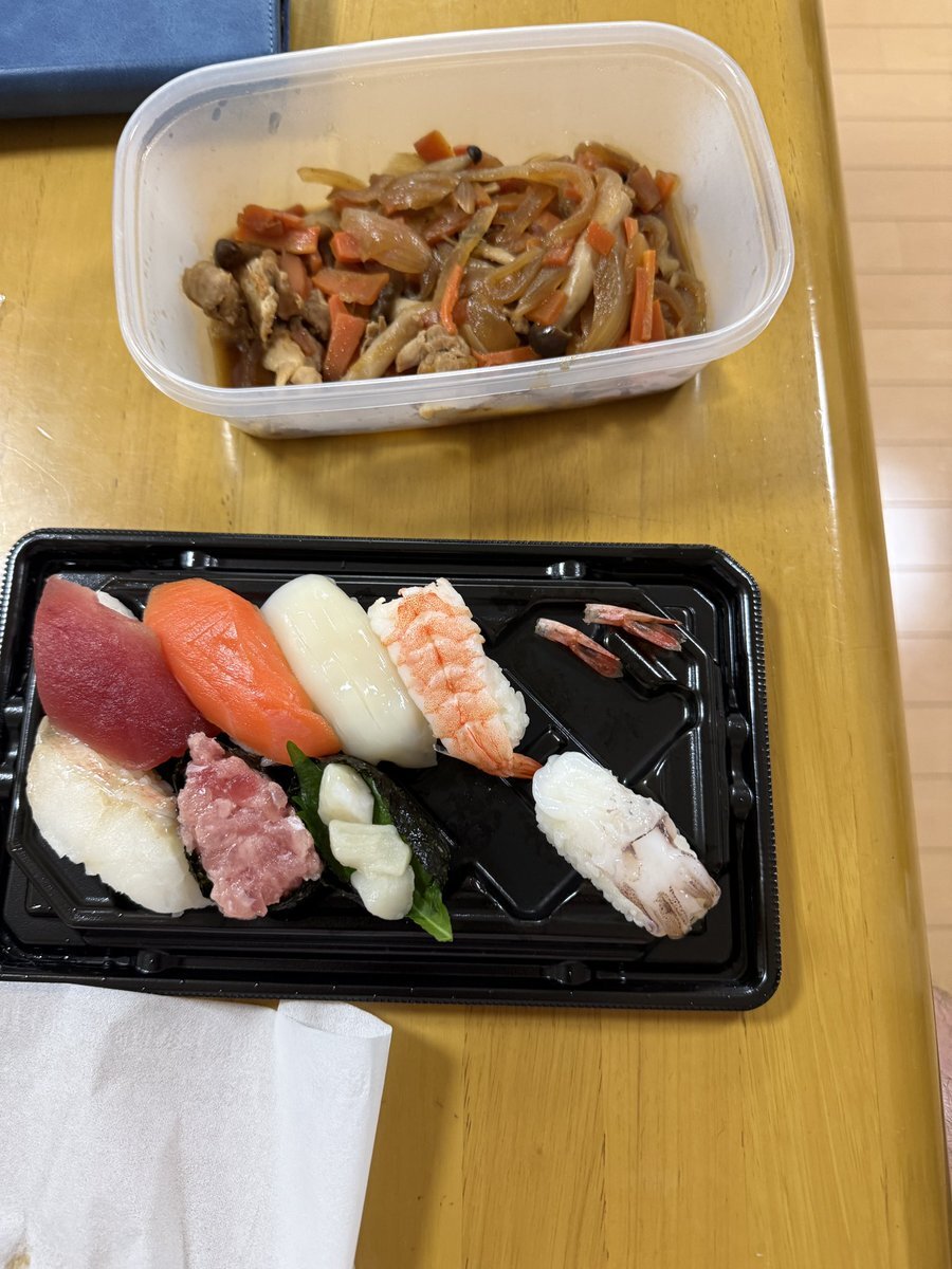 今日のお昼ご飯スーパーのお寿司 と昨日の夕飯(山芋の野菜炒め) 今日はお寿司の日なので、 スーパーでお寿司を買ってきました。 お腹すいたので食べさしですみません #お寿司の日 pic.x.com/KcuywAFFt5