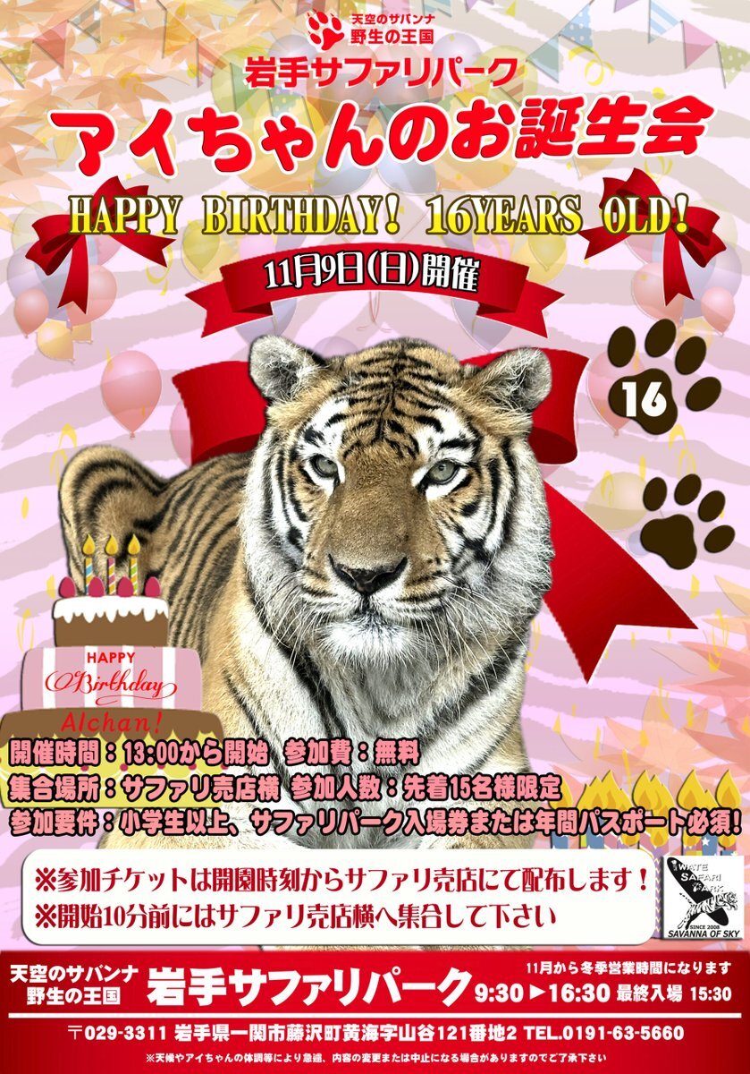 明日(11/9)はアイちゃんのお誕生会♪ ご参加お待ちしております!! 詳しくはポスターをご覧ください。 #岩手サファリパーク #IwateSafaripark #お知らせ #アイちゃんのお誕生会 #お待ちしております #にっこり #のんびり #ベンガルトラ #BengalTiger #アイちゃん #クラシックタイガー pic.x.com/sTVmtZxOWM