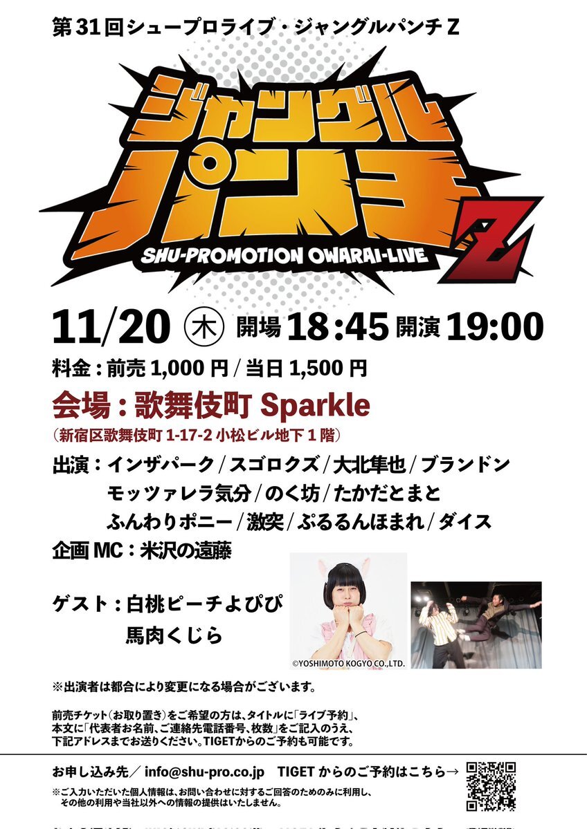 いよいよ来週です!!シュープロ事務所お笑いライブ「ジャングルパンチZ」ゲストは白桃ピーチよぴぴさんと馬肉くじらさんです!!お客様のご来場お待ちしております!! #ジャパゼット #お笑いライブ #歌舞伎町Sparkle #11月20日 #ゲスト #白桃ピーチよぴぴ #馬肉くじら #お客様のご来場 #お待ちしております pic.x.com/K44yPeBqyo