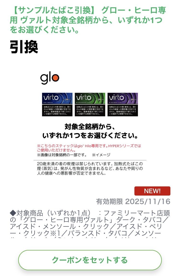ファミペイアプリ glo Hilo専用ヴァルト対象全銘柄から いずれか1つ無料 サービス ↓ ギフトを受け取る ↓ VAcPr3TeuSzCT まだファミペイアプリを 登録していない人は手順通りに 下記のコード入力すると ファミマポイント100円分貰える‼️ サービス ↓ ギフトを受け取る ↓ ギフトコード