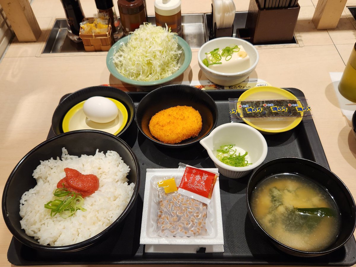 今日の朝御飯。 【松のや】 『明太子ご飯定食(小鉢・納豆)』[420円] (明太子、ご飯大盛2杯【おかわり無料】、味噌汁2杯【おかわり無料】、生卵、海苔、納豆、ねぎ) 『キャベツの千切り』[100円] 『冷奴』[100円] 『コロッケ』[クーポンにて無料] 頂きました。 #松のや #おかわり無料 #お手頃価格 pic.x.com/5q3cXokJHS