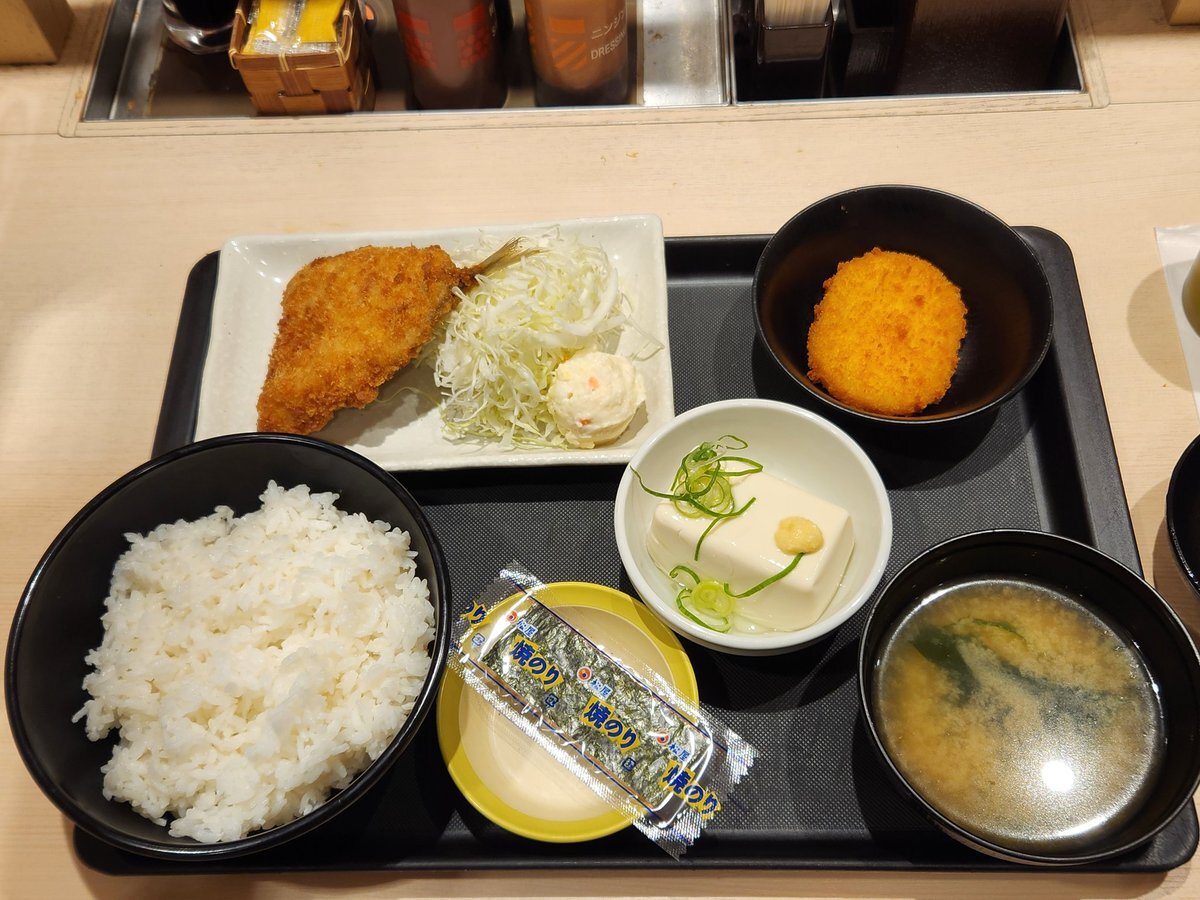 今日の朝御飯。 【松のや】 『特朝アジフライ定食(小鉢・冷奴)』[590円] (ご飯大盛2杯【おかわり無料】、味噌汁2杯【おかわり無料】、海苔、冷奴、キャベツの千切り、ポテトサラダ、アジフライ) 『コロッケ』[クーポンにて無料] 頂きました。 #松のや #おかわり無料 #お手頃価格 #おすすめ pic.x.com/RcHg7hQGTl