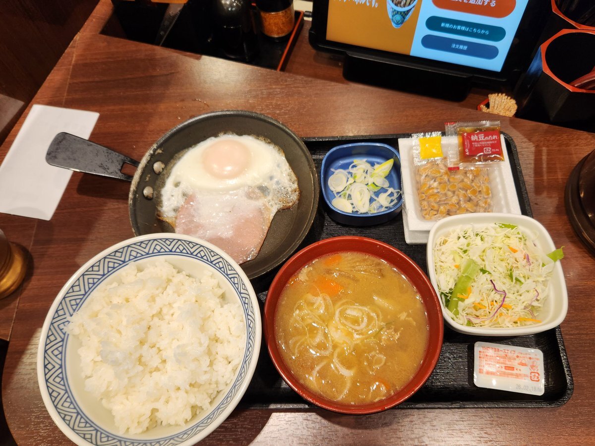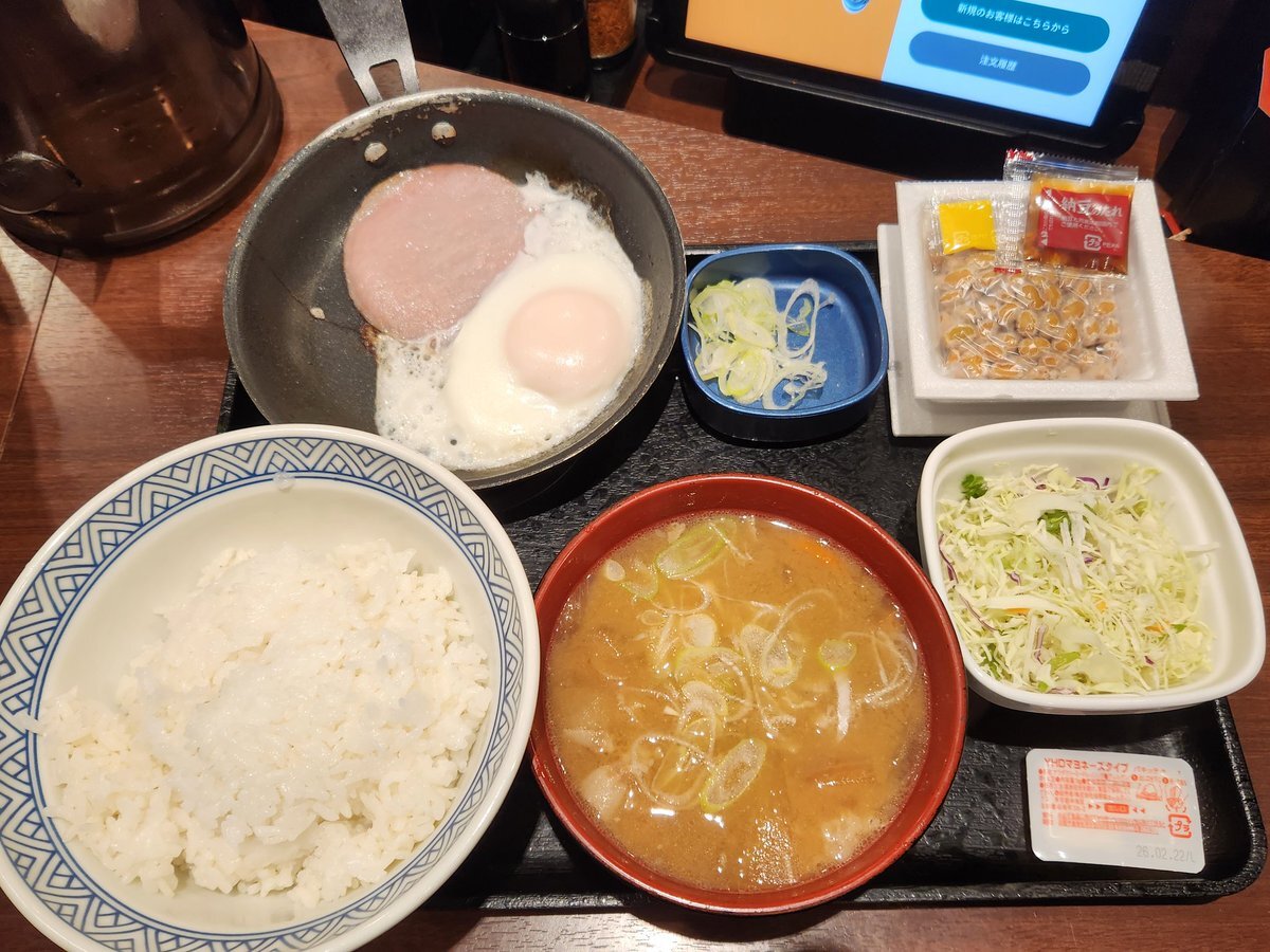 今日の朝御飯。 【𠮷野家】 『ハムエッグ納豆定食[468円](豚汁変更込み+154円)』[622円] (ご飯大盛2杯【おかわり無料】、豚汁(味噌汁より変更)、ミニ生野菜サラダ、マヨネーズ、納豆、ねぎ、ハムエッグ) 会計622円✨ 頂きました。 #𠮷野家 #定食ご飯おかわり無料 #おすすめ #お手頃価格 pic.x.com/qYtAQOoMEi
