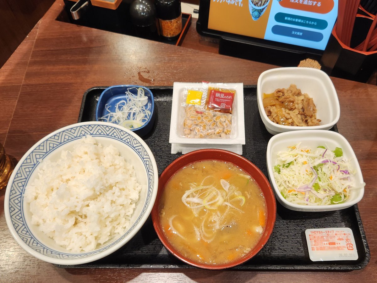 今日の朝御飯。 【𠮷野家】 『納豆牛小鉢定食[468円](豚汁変更込み+154円)』[622円] (ご飯大盛2杯【おかわり無料】、豚汁(味噌汁より変更)、ミニ生野菜サラダ、マヨネーズ、納豆、ねぎ、牛小鉢) 頂きました。 #𠮷野家 #定食ご飯おかわり無料 #お手頃価格 #おすすめ pic.x.com/Azht6TSCPE