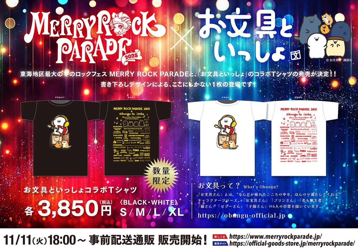 MERRY ROCK PARADE 2025 オフィシャルグッズ事前通販決定!本日11/11(火)18:00より受付開始します! 先んじて今年のコラボアイテムの1点をお知らせ! 大人気のSNS発の癒し系キャラクター「お文具といっしょ」とのコラボ(書き下ろし)が決定!販売は本日18:00より同時に先着販売となります。