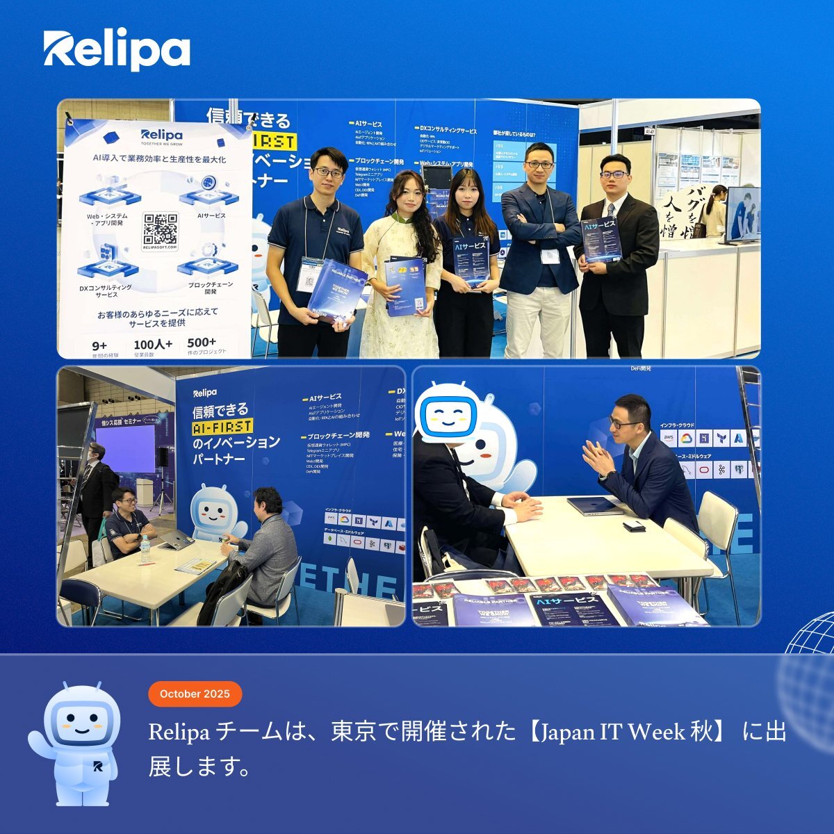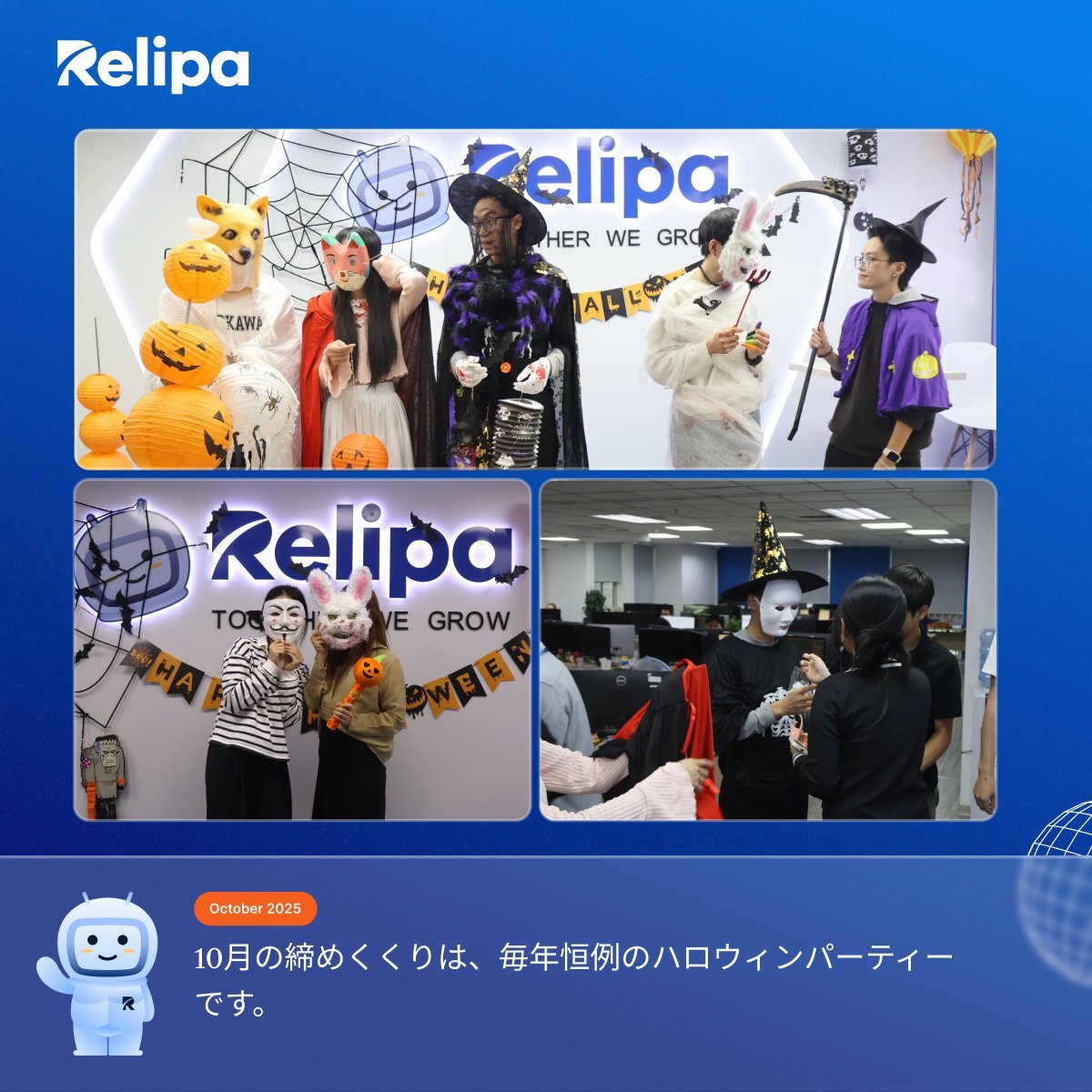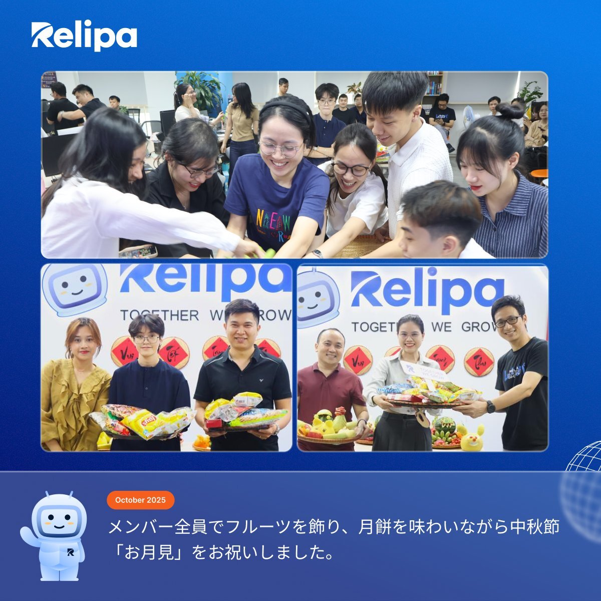 🎉【Relipaの10月を振り返って】 10月は、Relipaにとってイベント盛りだくさんの1ヶ月でした!✨ ✨社内の温かな交流からグローバルな挑戦まで、Relipaはこれからも「プロフェッショナルを大切にしながら成長を続けていきます。 #Relipa #お月見 #社内イベント #SODECJapan #AI #JapanITWeek pic.x.com/tImT3y4gxb