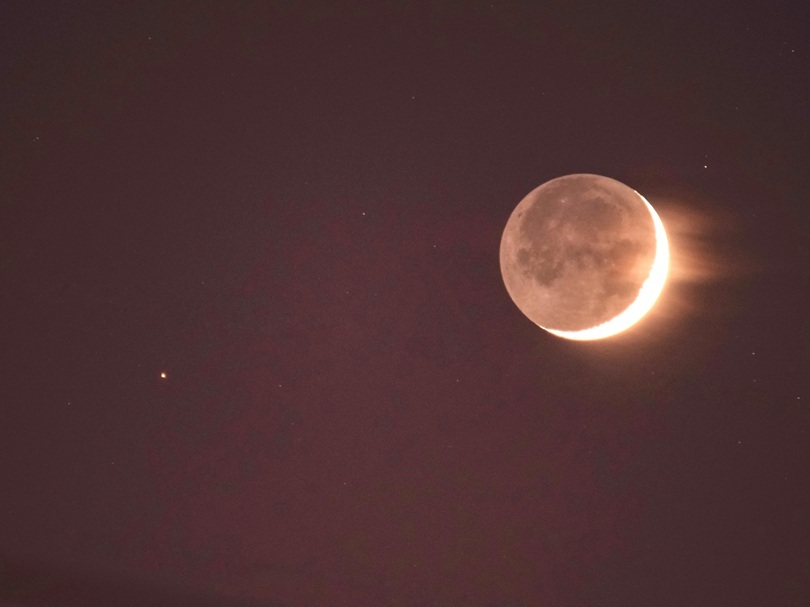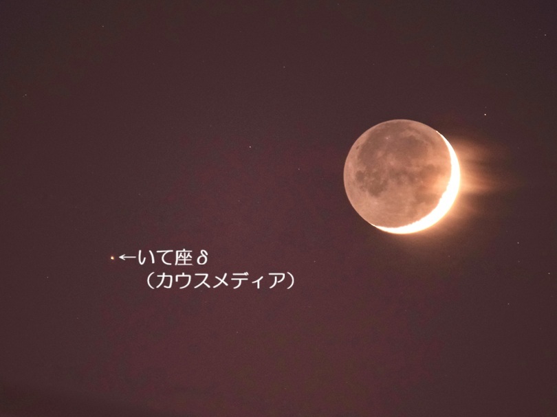 【四日月と射手座δ星の接近】 夕方、子どもたちが 「お月さま見つけた!」と指さした先に、 とても細い四日月が✨ 帰宅して撮ってみると、 すぐそばにいて座δ星・カウスメディアが寄り添う美しい光景でした。 今日の夕空、見られましたか?🌙 # #四日月 #いて座 #お月見 pic.x.com/CNKfhLB1p4