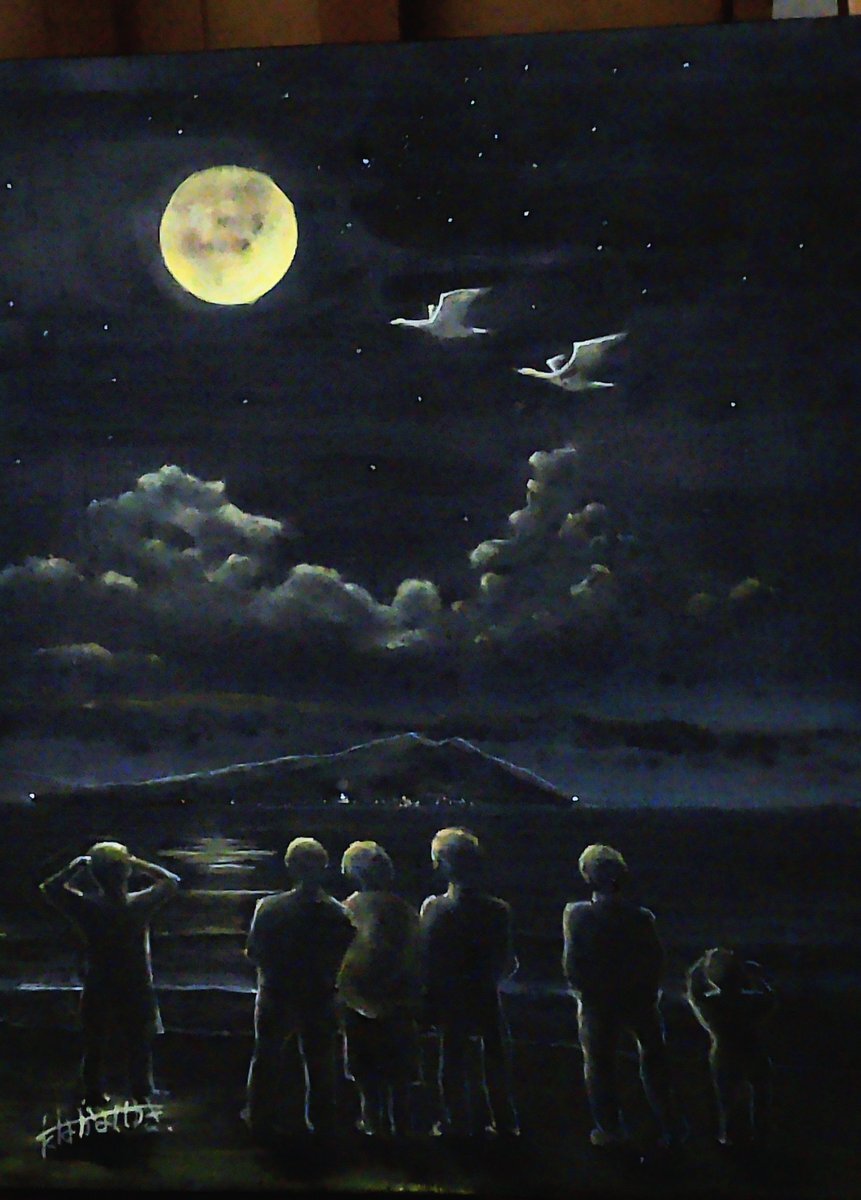 [ お月見 ](F 6) 音が見えるアクリル画 東伊豆 満月に 我が思い持ち 鳥向かう 願い事たくさん届け #音が見えるアクリル画 #アクリル絵の具 #アクリル画 #イラスト #デッサン #伊豆半島 #東伊豆 #伊豆大島 #満月 #お月見 #雨宮暗香 #アート #絵画 #海岸 #波の音 #カモ #日本 #Japan pic.x.com/gduV7MyNCb