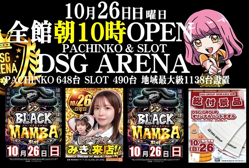 明日26日日曜日 休日👑ARENA朝10時OPEN‼ 多くのお客様ご来店契機に😃ここぞの配布 🎁#DSGオリジナル 総付景品 💗レディナナみきさんお手伝いに来店 x.com/MIKI64569054 🐍シンBLACK-MAMBA⬛️全館取材 休日もアリーナ野々市店で お楽しみ下さいませ☺️ #最新台導入済 入場抽選⏰9:40開始
