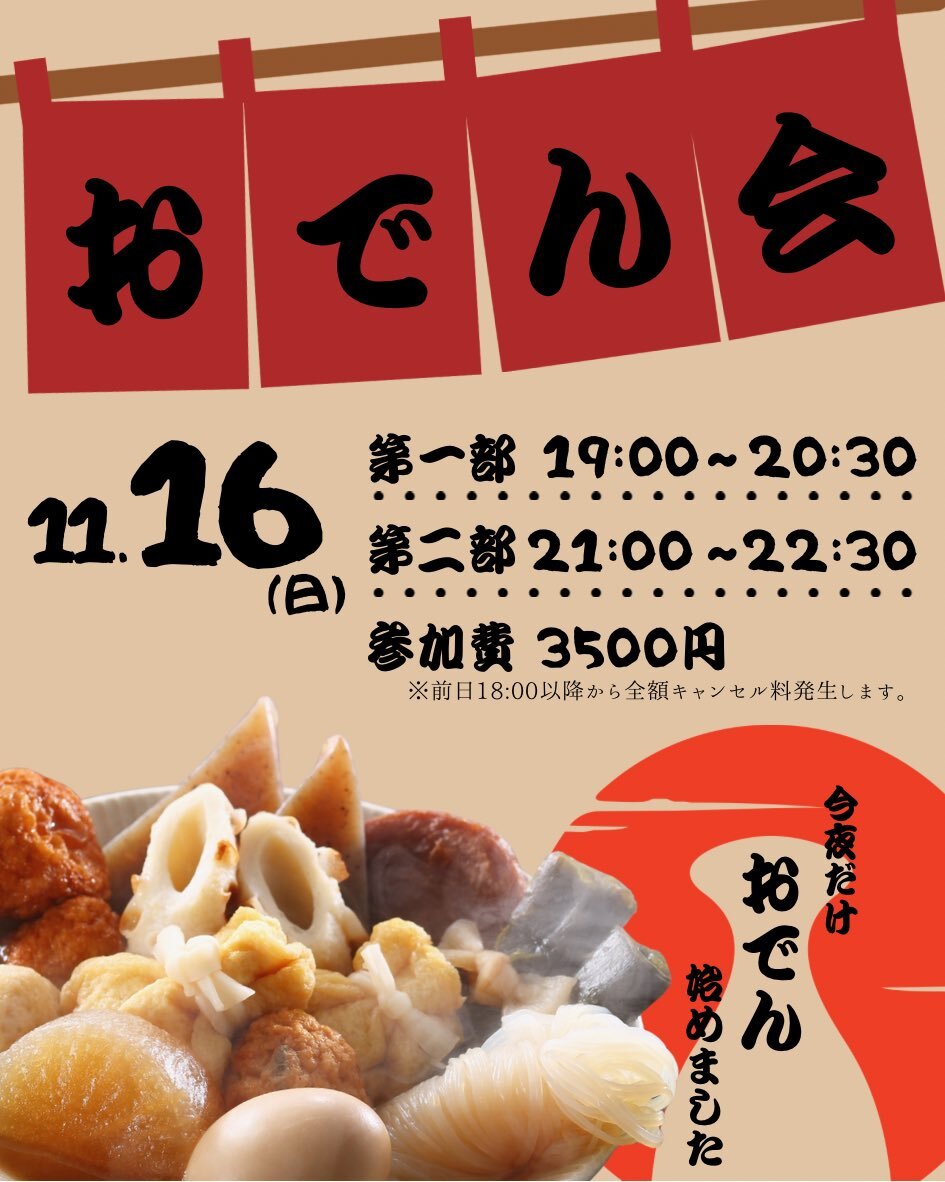 アロハー🏝️ 本日おでん会やります🍢 空席状況はこちら💁 ・1部→空き2席 ・2部→空き1席 おでん食べて、一緒に乾杯して憂鬱な日曜から希望の日曜へ🎵 きっと明日も頑張ろう!ってなれるはず✨ プロフィールのリンクから要予約! ぜひお待ちしています😊 #waioli #お酒が好きな人と繋がりたい pic.x.com/4Dm9FH7Gvl x.com/waioli_osaka/s…