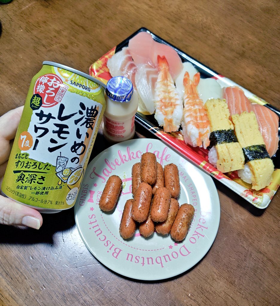 寿司とカレー味のソーセージ! 今日職場の先輩に教わったソーセージ! カレー味めっちゃ美味い😋 🍻✨️🍻✨️🍻 今週前半お疲れ様です🙌 #Twitter晩酌部 #ツイッター晩酌部 #X晩酌部 #お酒が好きな人と繋がりたい #おつまみ #とにかく呑み隊 #おうち居酒屋 pic.x.com/OJJgdU0HxV
