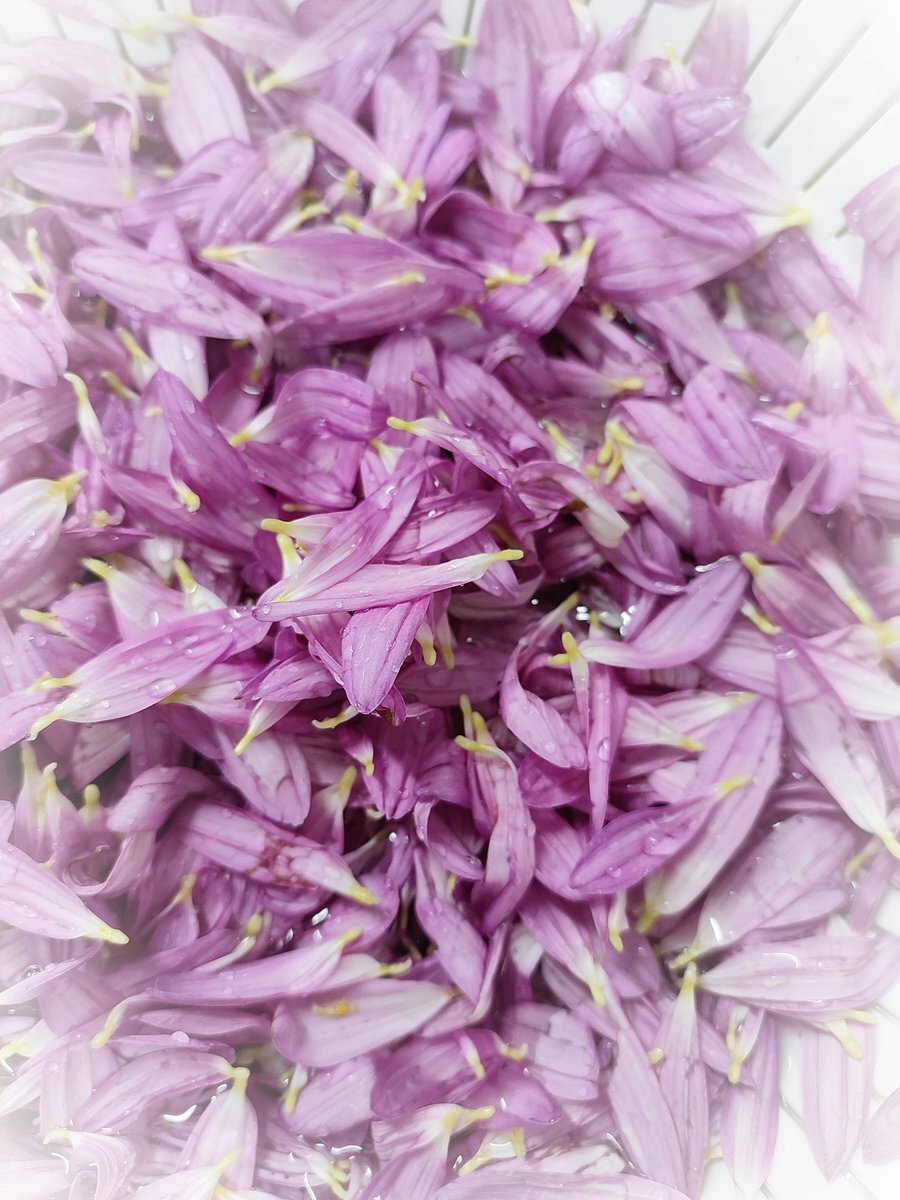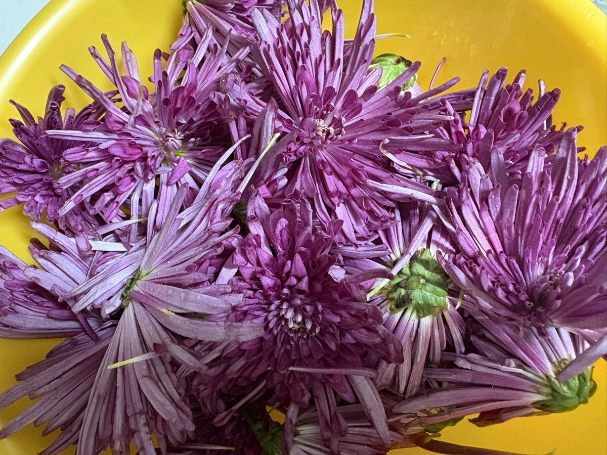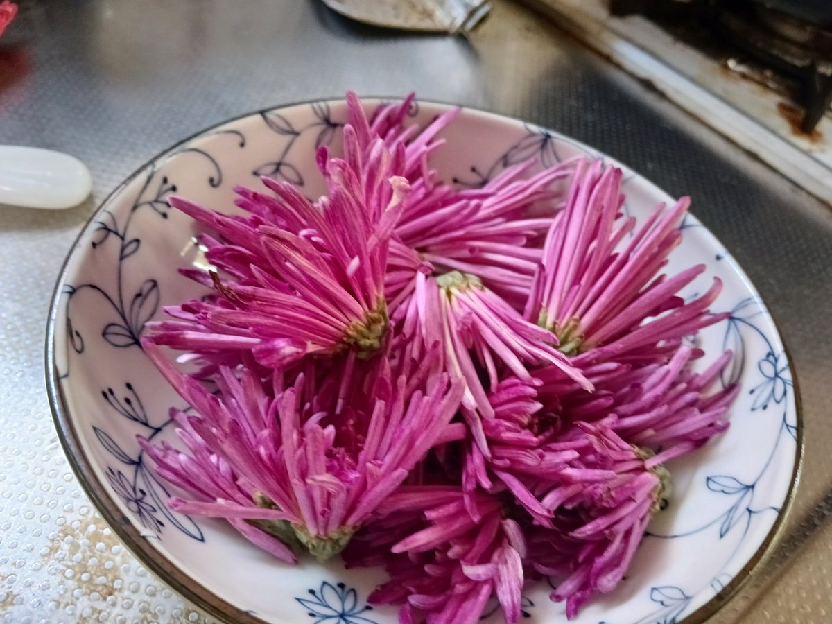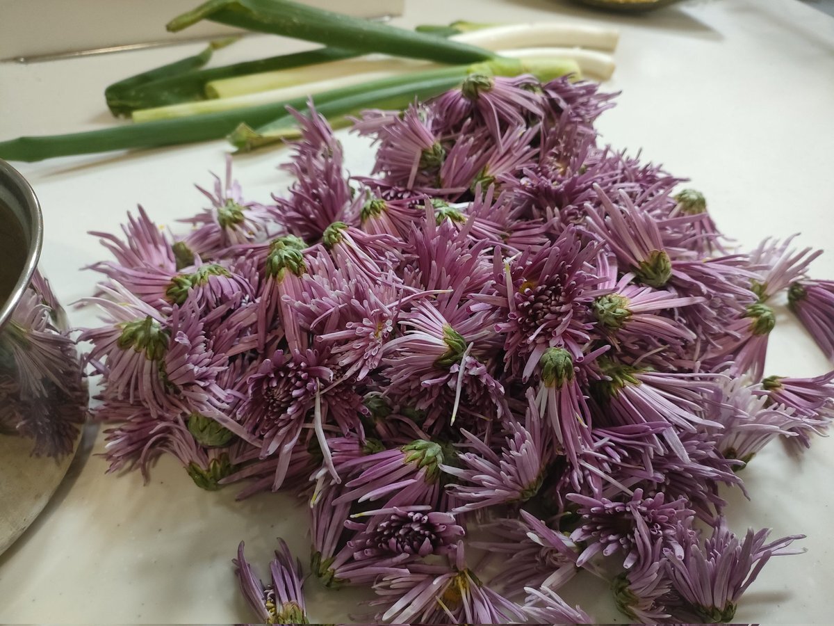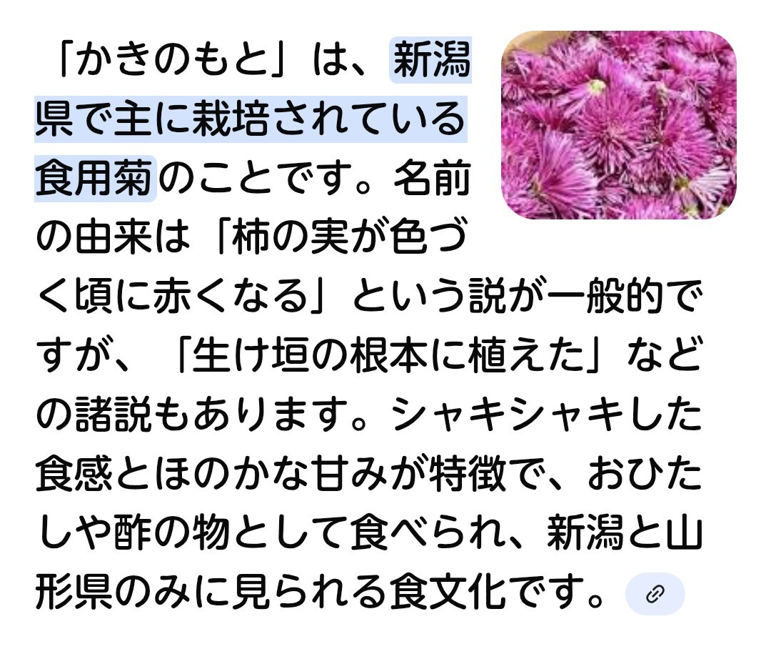 食用の菊の花☺️紫色もありますね🟣小さい頃は彩りを添えるもので食べないと思ってましたが酢の物として頂けます😃苦味とほんのり甘さがありシャキシャキ食感🤙菊は中国から流入し観賞用→霊薬→食用の道を辿ったようで新潟では江戸時代からの食用の記録があるそう😊 #かきのもと #おうちごはん #延命楽 pic.x.com/zE0hcYf69s