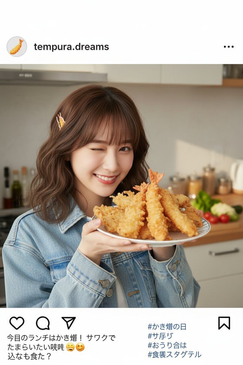 今日のFinstagram(#Gemini に作らせた架空の #Instagram です。) 今日はかき揚げの日ってことでこちらです。 #AIart #AI美女 #AI美女リアル #インスタ #かき揚げの日 #天ぷら pic.x.com/A9Iubwh5mK