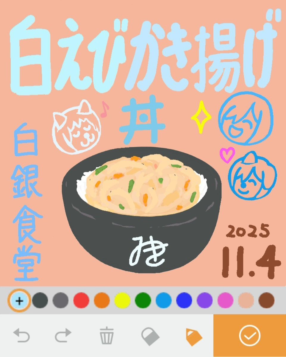 【11/4②】 『🤟白銀食堂🦐白えびかき揚げ丼🍚』 #REALITYで描いてみた #REALITYイラスト部 #白銀食堂 #かき揚げの日 🎁Thanks なっちゃん 流れ肉球🐾×2、にゃー🐱 九鳥森さん 合体炭酸シャワー🥂、本日の主役🌸 雲雀さん おにぎり🍙 こばさん はらぺこっ!🤤×2 pic.x.com/nfAYUlau20