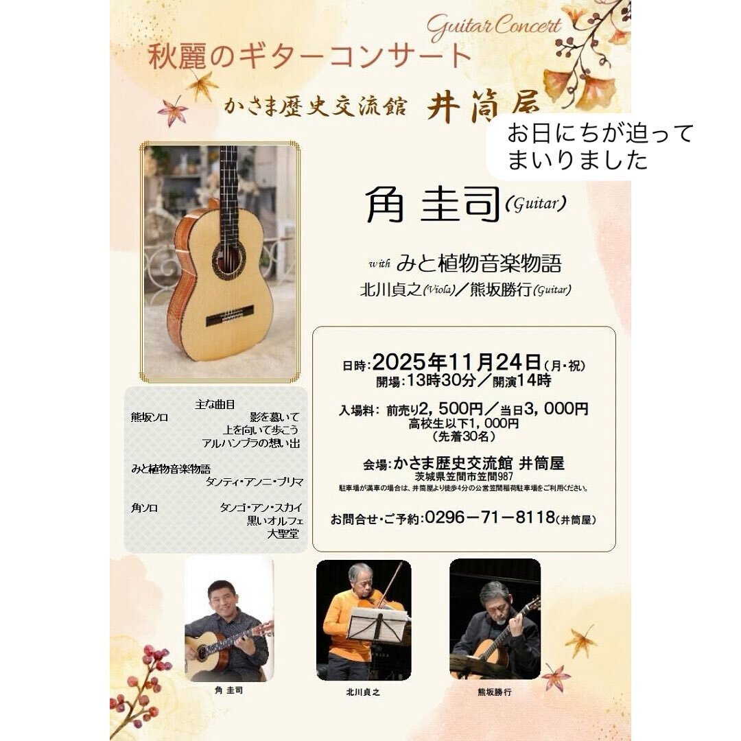 🎶クラシックギターとビオラが織りなす美しい響き🎶 ・11/24(月・祝)14:00開演 🎸角圭司/熊坂勝行 🎻北川貞之 予約2,500円(当日3,000円)高校生以下1,000円 ☎️0296-71-8118 #笠間 #かさま歴史交流館井筒屋 #ギター #ビオラ #昭和歌謡 pic.x.com/zAtlWvnOun