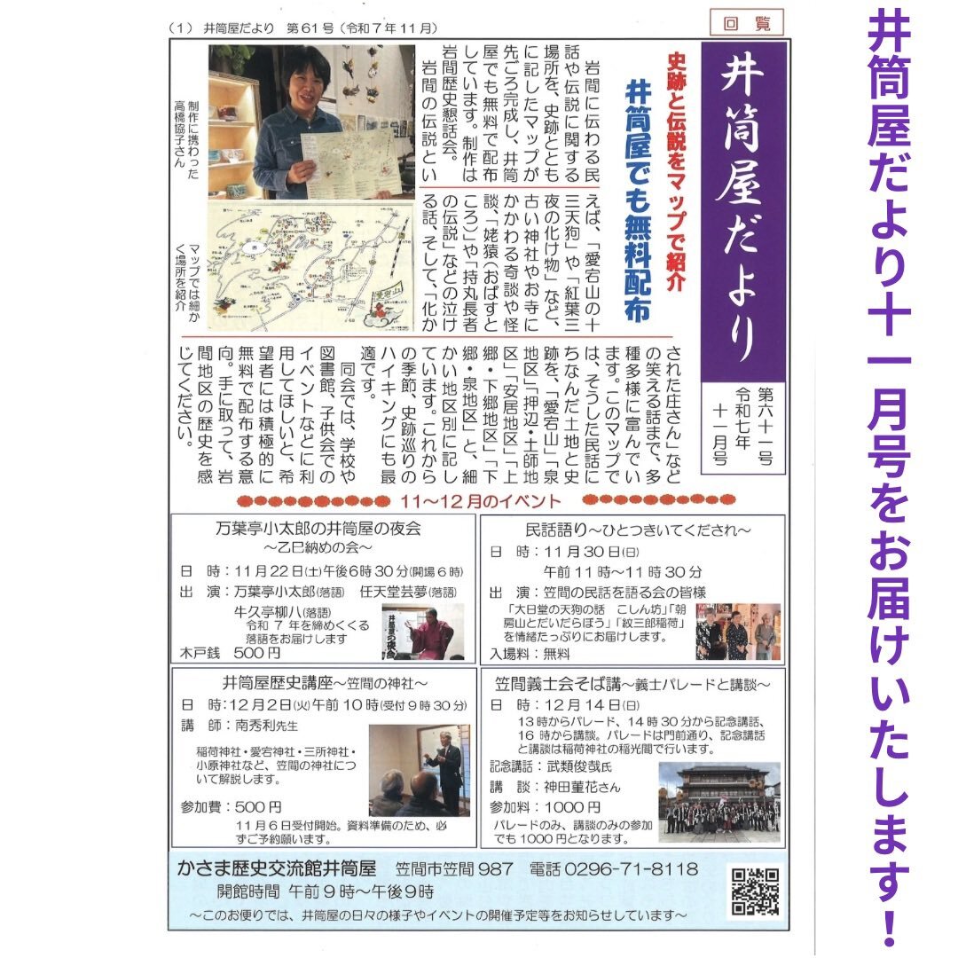 #笠間市情報 #かさま歴史交流館井筒屋】 井筒屋より下記のチラシが届いています。 ◆井筒屋だより11月号 ◆トモアほのぼの寄席(12/20(土)開催) ◆井筒屋菊酒祭り(11/23(日)開催) チラシコーナーよりご自由にお持ちください。 #井筒屋 HP→kasamaidutsuya.com X→x.com/kasama_idutsuya