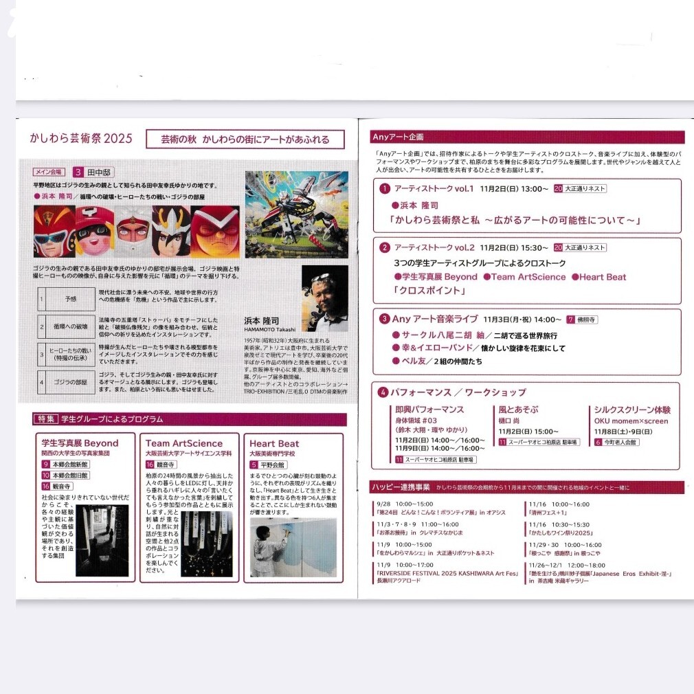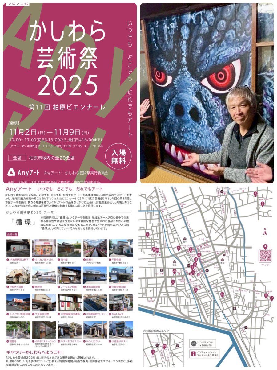 11月2日から始まっている「かしわら芸術祭2025」。ゴジラの生みの親である田中友幸邸では、壁一面のゴジラの絵が迫力満点でした!他にも魅力あふれる作品がたくさんあります。芸術祭は市内20会場で開催中!ぜひ皆さんも足を運んでみてください! #柏原市 #かしわら芸術祭 pic.x.com/VkPoeqyxT3