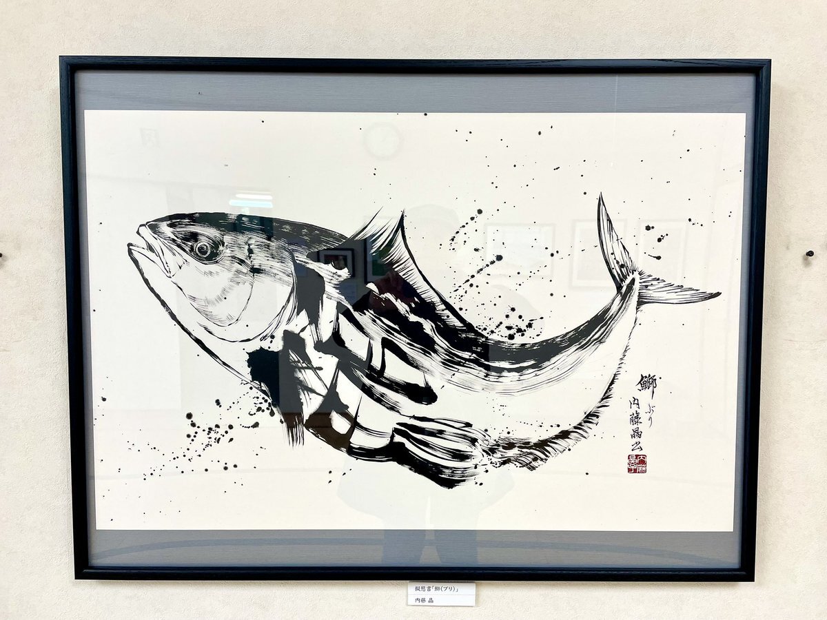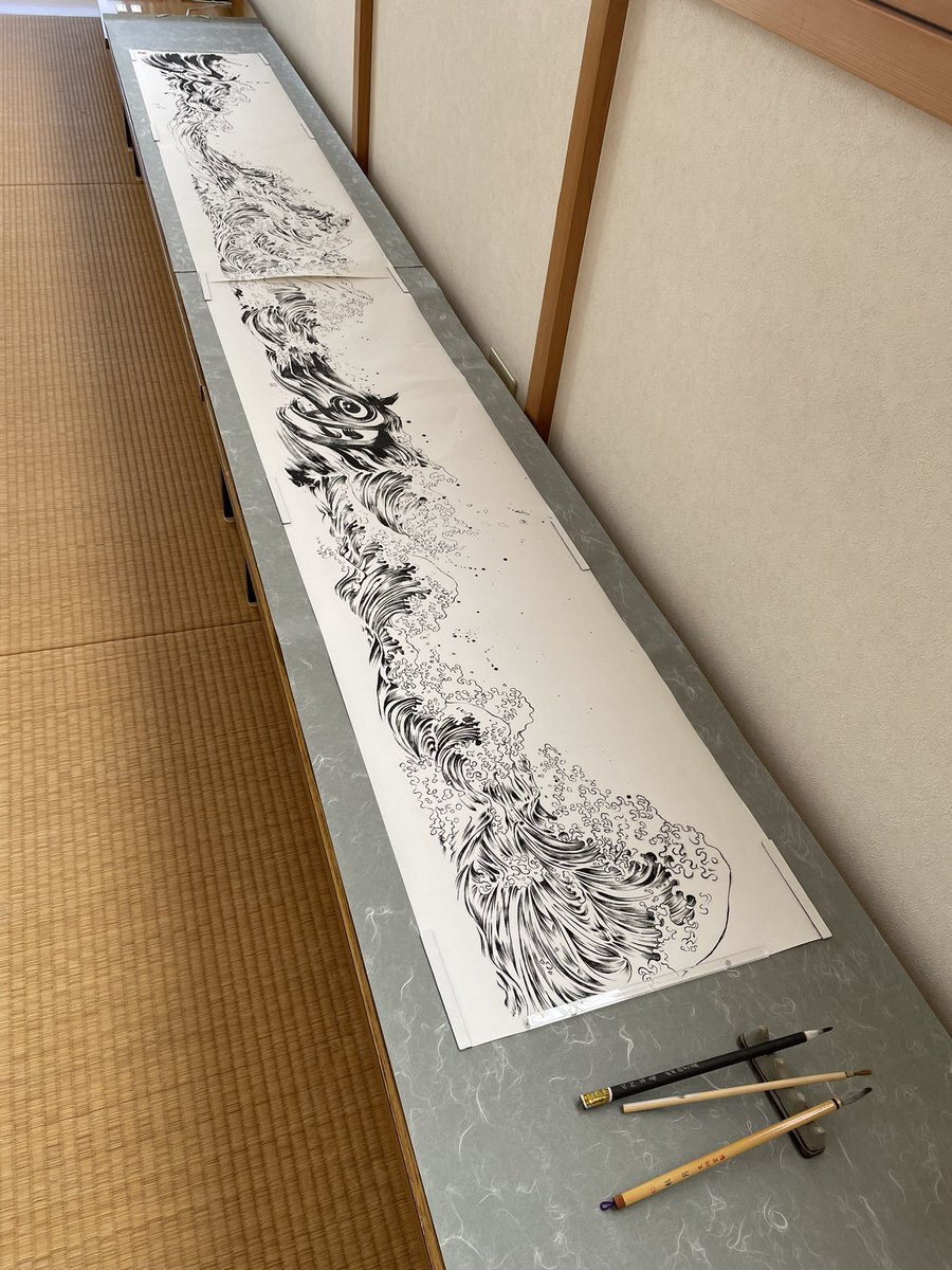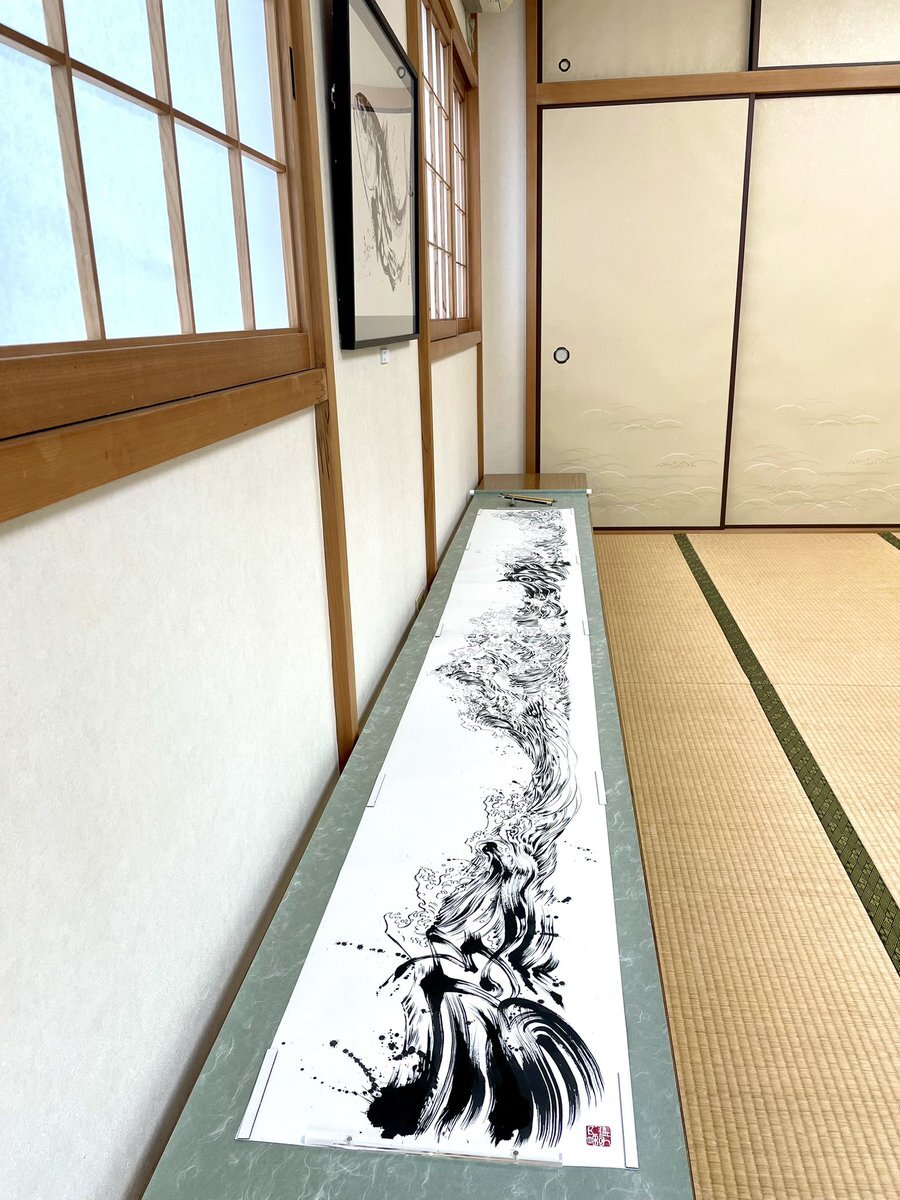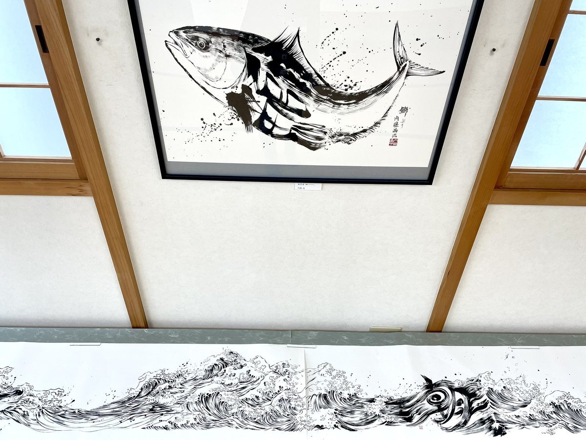 2m70㎝の波と潮の「書」の作品を見下ろして顔を上げると鰤という「書」が飛び跳ねています。 #柏原ビエンナーレ #かしわら芸術祭 #擬態書 pic.x.com/RL0Zwmeh47
