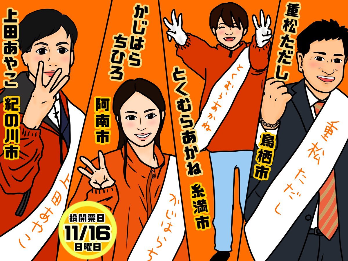 クワトロ選挙٩( 'ω' )و🗳️✨ 応援ダァアアアファイヤァアアア✨🔥 🗳️投開票日🗳️ 11月16日(日) 🟠和歌山県 #紀の川市議会議員選挙 #上田あやこ 🟠沖縄県 #糸満市議会議員選挙 #とくむらあかね 🟠佐賀県 #鳥栖市議会議員選挙 #重松ただし 🟠徳島県 #阿南市議会議員選挙 #かじはらちひろ