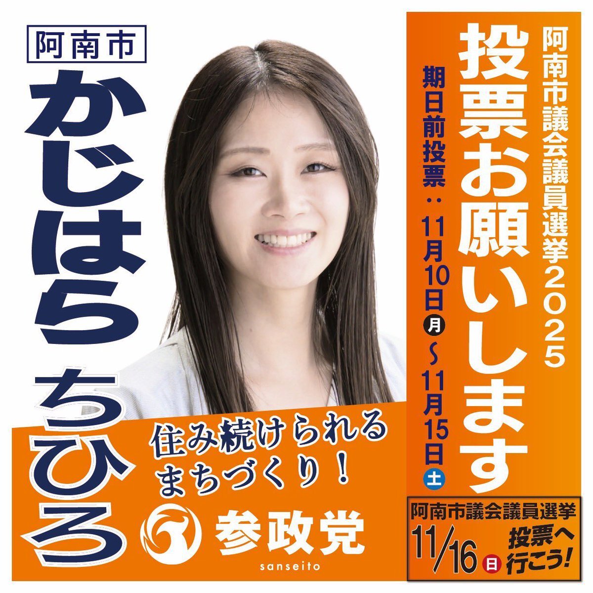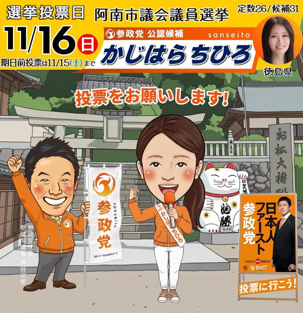 #紀の川市議会議員選挙 #上田あやこ候補(和歌山県) #糸満市議会議員選挙 #とくむらあかね候補(沖縄県) #鳥栖市議会議員選挙 #重松ただし候補(佐賀県) #阿南市議会議員選挙 #かじはらちひろ候補(徳島県) #参政党加速中 拡散!応援!#選挙へ行こう 11月16日(日)(ノ◕ヮ◕)ノ* x.com/bebebebekkoame…