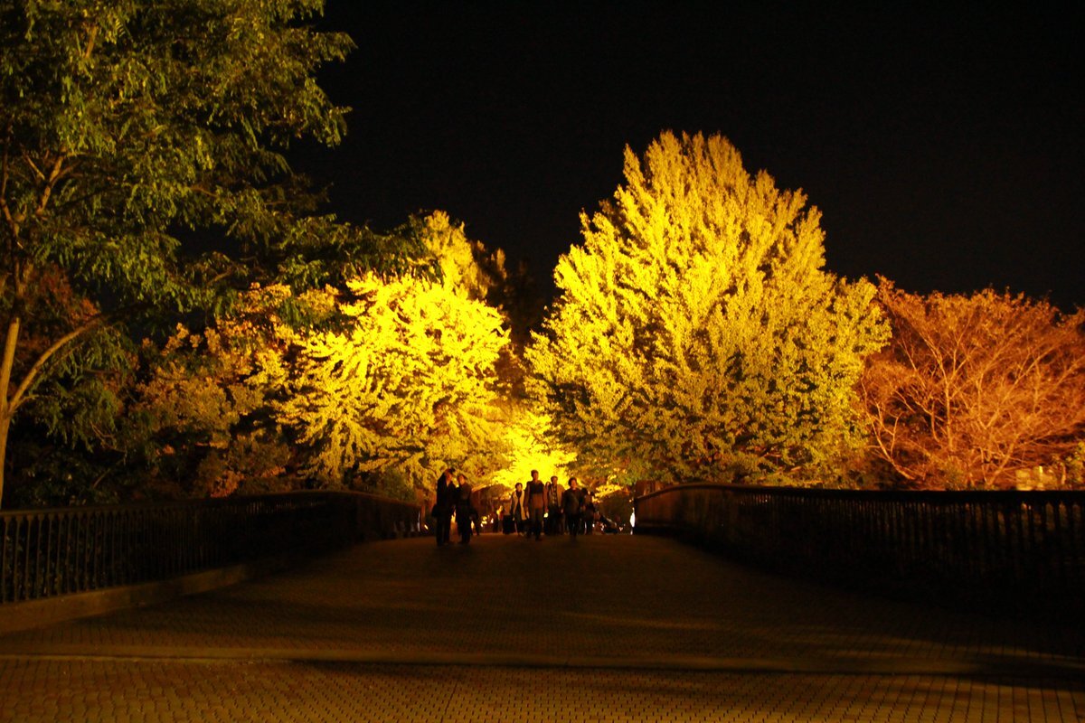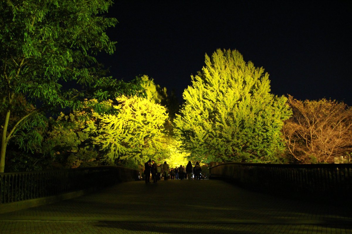 【#イチョウ並木】 #国営昭和記念公園…①#カナール(立川口入りスグ)②#かたらいのイチョウ並木(西立川口入り左方向)~20:30ライトアップ中。あと数日でこの風景は見れない。来訪者の年代は10代~20代が半分と若い… pic.x.com/o5cJBwlGNe