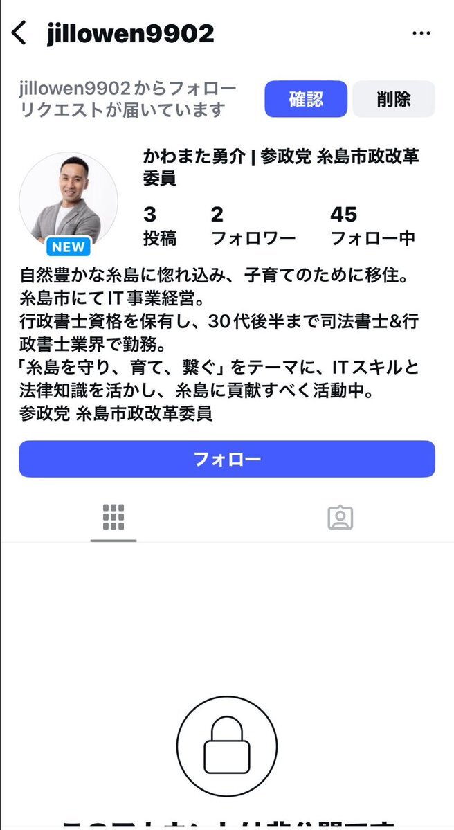 Instagramですが、なりすましアカウントが発生したそうです。 正しいIDは kawamata_yusuke_sanseito です。 ご注意ください! 投資の勧誘などは一切いたしません! #参政党 #糸島 #かわまた勇介 pic.x.com/6mVul4R0tT