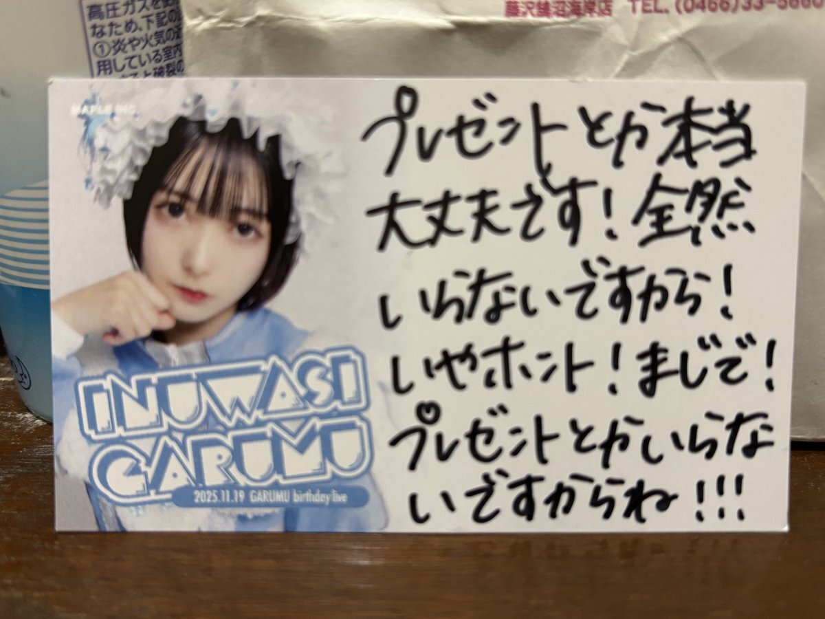INUWASIがるむちゃん生誕祭 2025.11.19 Veats Shibuya 大好きなINUWASIの中でも1番の推し! ライブでの興奮、トークでの感動、じゃんけん大会での笑い、色んながるむちゃんの魅力が詰まった生誕祭でした😊 12/8東名阪ツアー初日、良い番号ゲットできたので今から楽しみぃ〜😆 #がみむメモ pic.x.com/amn6EMBjAp x.com/INUWASI_O/stat…