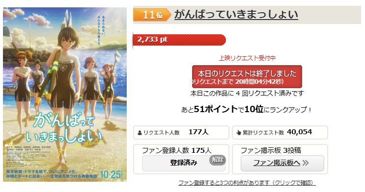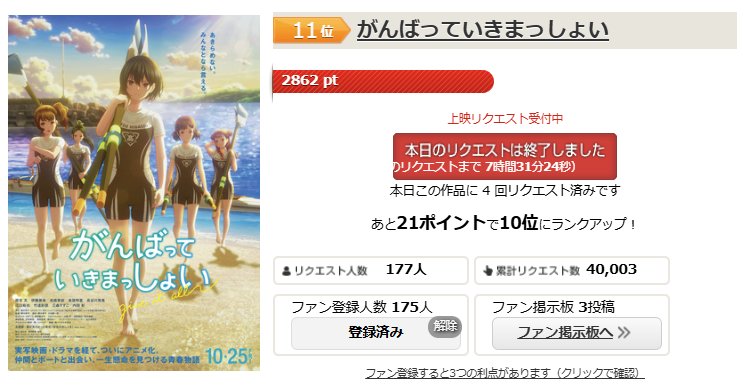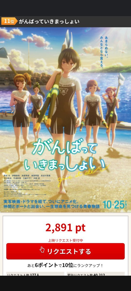 ドリパスの『がんばっていきまっしょい』 現在の順位は11位 超特急作品に抜かれるのはいかんともし難いです まずは2,900ptを目標に、10位の作品を追って行きましょう 諦めて投票する人が減ってしまうのが一番恐ろしい #がんばっていきまっしょい 投票はこちらから→ dreampass.jp/m394325 pic.x.com/c5cjattKrY