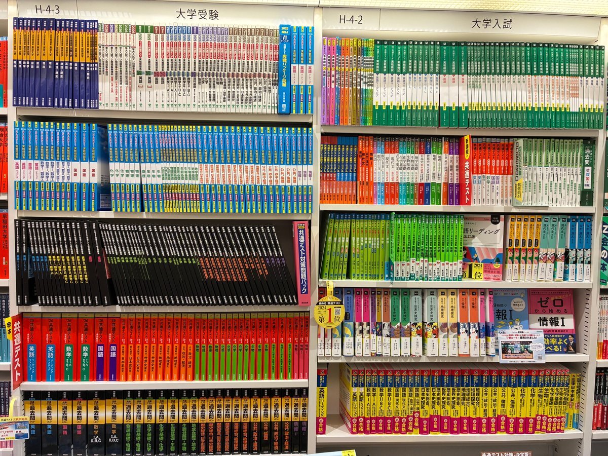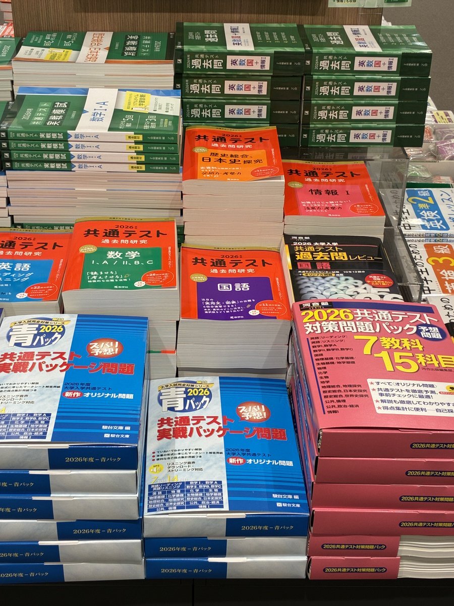 【共通テスト】10月に入り共通テスト関連の問題集、売れ行き加速中💨朝イチ補充前の棚、昨夜売れたあとの空間が目立つようになりました(このあとギッチリ補充済👍)模擬試験パックも各社入荷中🌠 そしてお店のエントランスにはエヴァの皆さんが! #共通テスト #がんばれ受験生 pic.x.com/c6ZXqR4PMs