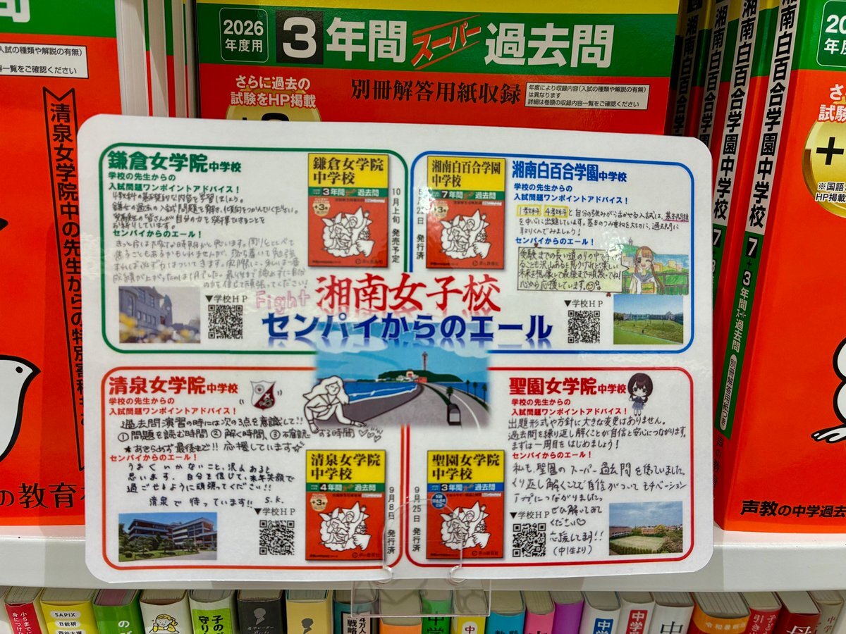 【中学受験】毎年恒例・声の教育社さんより「湘南女子校センパイからのエール」POPいただきました!学校の先生からは「入試問題ワンポイントアドバイス」👍 そしてかつて受験生だった先輩、彼女たちもめちゃめちゃ苦しい時期があったんだな…とこっちが胸アツ😭 #声の教育社 #がんばれ受験生 pic.x.com/n3RPjXzmHa