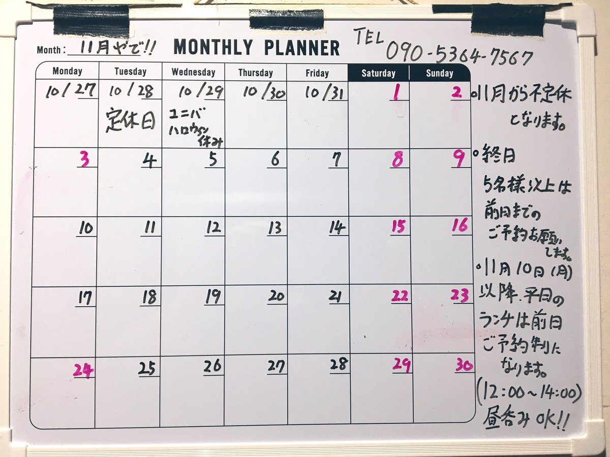 11月のスケジュール 定休日火曜日→不定休 正倉院展後は平日ランチ →前日ご予約制(12:00〜14:00) 一度の来店は上限4名様まで ※平日ランチはミニマムチャージ無し ご予約のない平日は14時からハッピーアワー&1000べろやります。 終日5名様以上は予約をお願いします。 #きたまち食堂ファミリア pic.x.com/GnTyUwFlgc