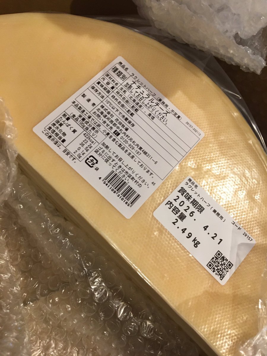えっ! 予定よりも1週間早く届いた⁉️ ありがとうございます😊 北海道は花畑牧場からラクレットチーズ🧀 今日…17時からフライングで…やります♪ #きたまち食堂ファミリア #隠れ家酒場ファミリア #ラクレットチーズ pic.x.com/RBAYXuFgDN